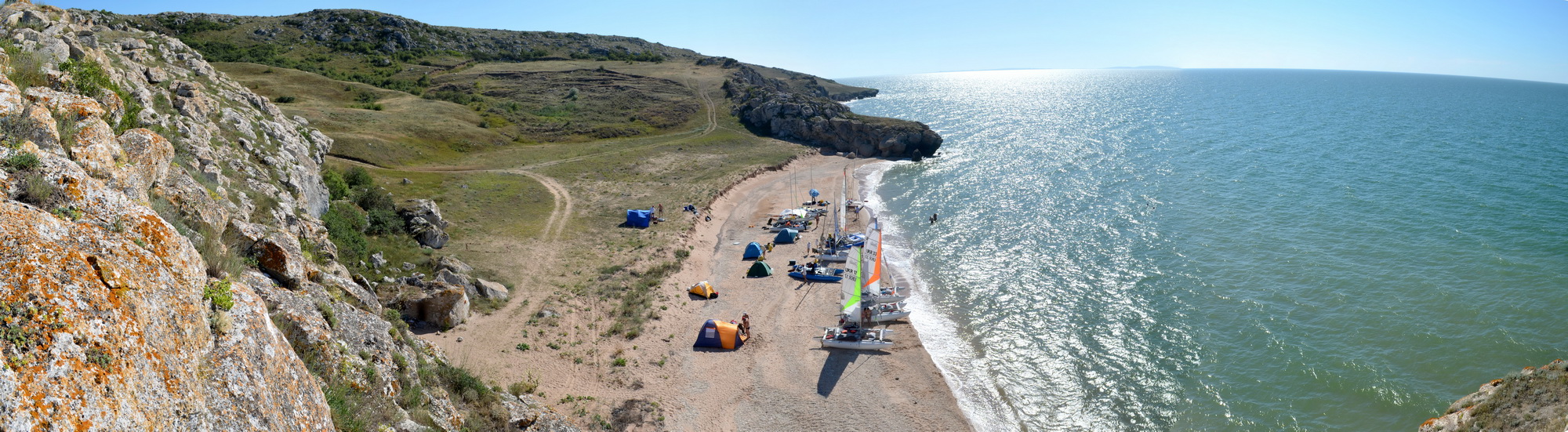 27 июня 2013г. В этот день, в планах была стоянка на генеральских пляжах, в одной из бухт, не доходя до мыса Чаганы. На всякий случай запланировали промежуточный финиш в Курортном. До первого мыса флот шёл в лавировку, но после огибания мыса получилось нести геннакер, что существенно ускорило продвижение. Основная часть флота быстро добралась до Курортного, гдебыло принято решение идти дальше. После дозаправки пивом и мороженым регата двинулась вперёд. Крутой бакштаг под геннакером в свежий ветер - идеальная комбинация. До назначенной бухты добрались очень быстро. Хоть максимальная скорость в этом переходе не блистала и была немногим больше20 км/ч, зато средняя вышла около 15 км/ч, что само по себе неплохо. В запланированной бухте, всё же остановится не получилось, так как её оккупировали нудисты. Решили остановиться в соседней, никем не занятой бухте. Оставшееся время гуляли по окресностям и отдыхали. Когда солнце спряталось за горизонтом, проявилось удивительной красоты звёздное небо. День удался!