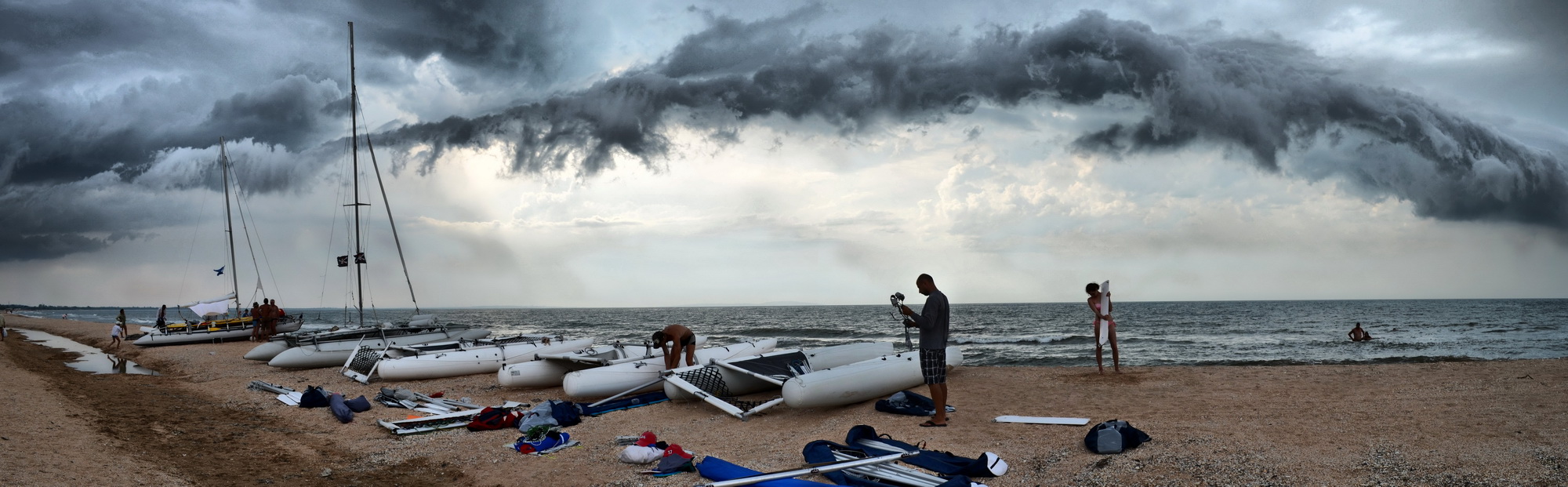 К вечеру, неспеша разбираем катамараны и … … не успеваем их упаковать и погрузить в машину. С моря приходит грозовой фронт. Сначала усиливается ветер и начинает мести по берегу мелкий ракушняк, а затем начинается дождь. В таком, мокром и облепленном ракушками, виде катамараны пакуем в машину.