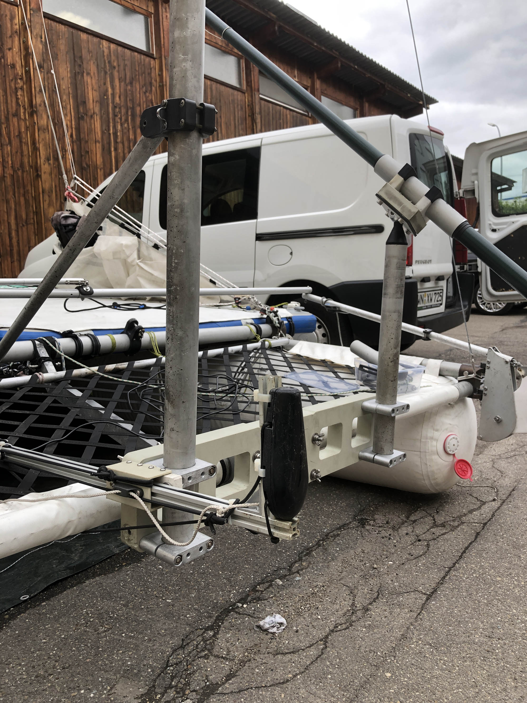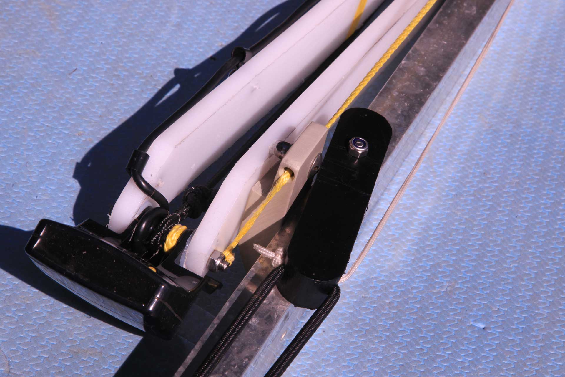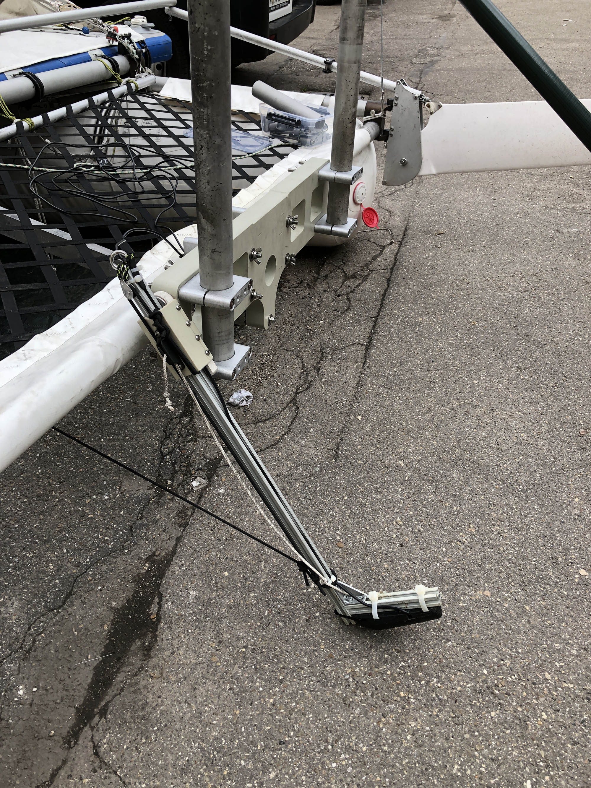 Новый транец, и новое крепление датчика сонара с регулировкой по заглублению. Минус - не откидывается при наезде на препятствие. Устраню в следующей версии. Перенесу на боковой торец транца через пластину на оси. При наезде вся пластина провернется назад и вверх. Что-то по принципу горнолыжных креплений