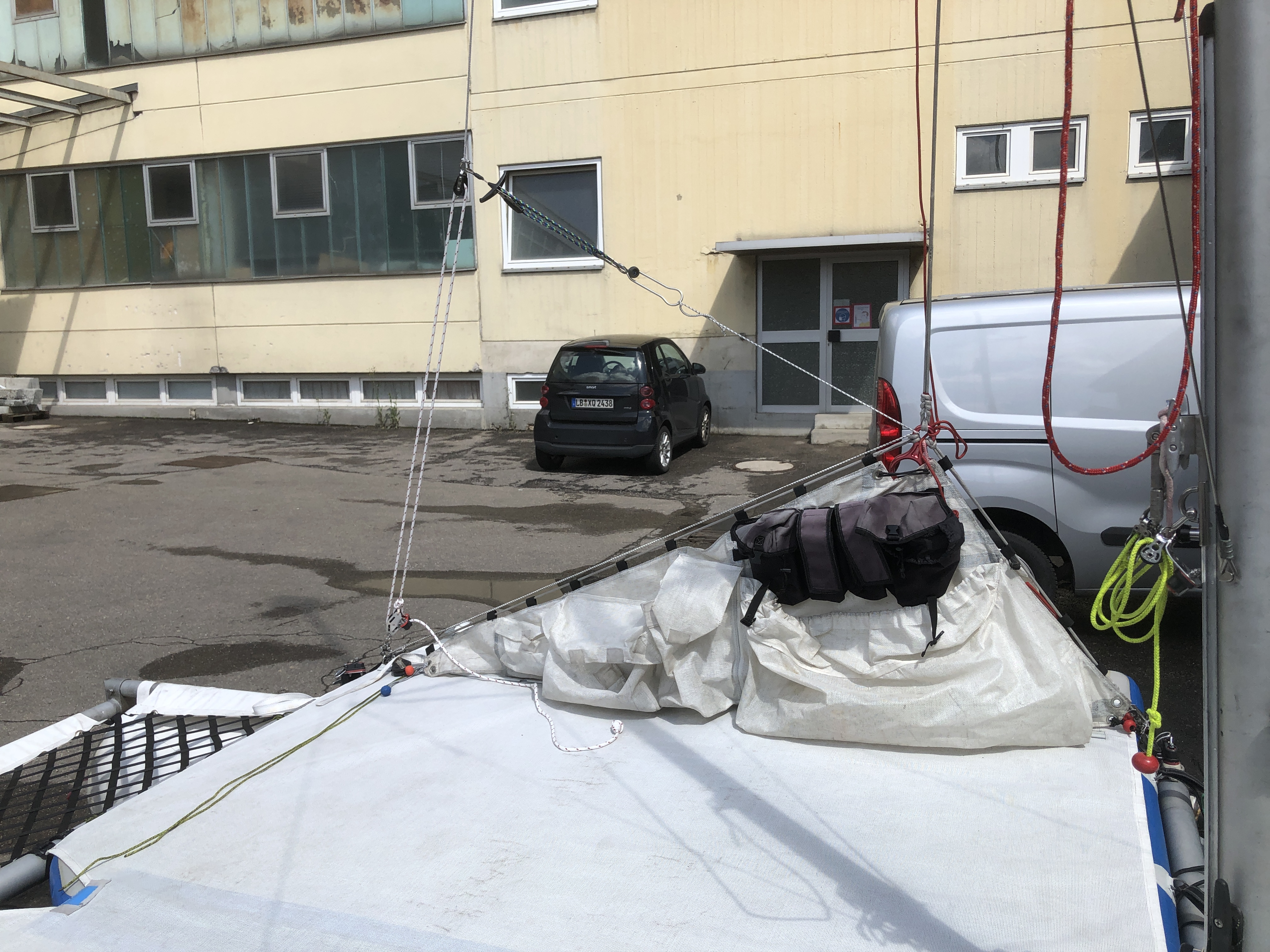 Когда выходишь на трапецию и одновременно управляешь судном очень сложно удержаться в корме. Трапеция постоянно тянет вперед. Я уже даже подумывал соорудить петли для ног как на серфе. Но оказалось, что если трапецию встроить как часть закладного бакштага, то проблема утаскивания к мачте исчезает сама собой, т.к. полиспас бакштага дает возможность зафиксировать точку подвеса в удобном для рулевого месте.