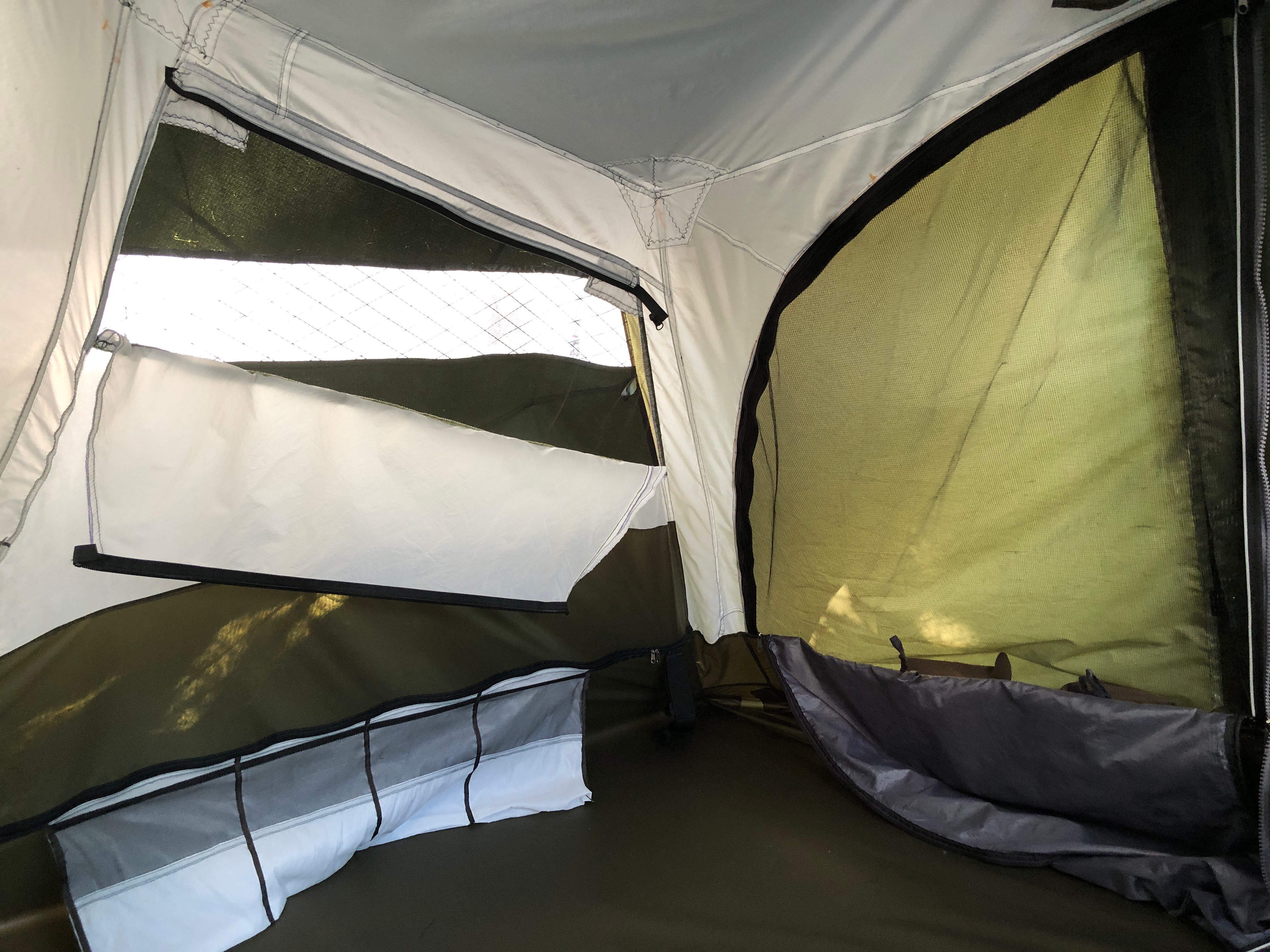 Спальная палатка расчитана на четверых. У каждого есть два кармана для личных вещей и крепление для бутылки с водой. Вход/выход из спальной палптки на корму и в кухонную палатку. Между палатками тамбуз защищающий от дождя. В внешней спальной палатке окна на три стороны. Во внутренней, напротив окон, вставки из черной противомоскитной сетки. Через эту сетку все видно, даже при низкой освещенности снаружи. Вставки могут прикрываться занавесками, это для того, чтобы при вклученном освещении в палатке снаружи не просматривалось. Ппротивомоскитные сетки на обоих выходах также могут закрываться полностью или частично непродуваемым слоем.
