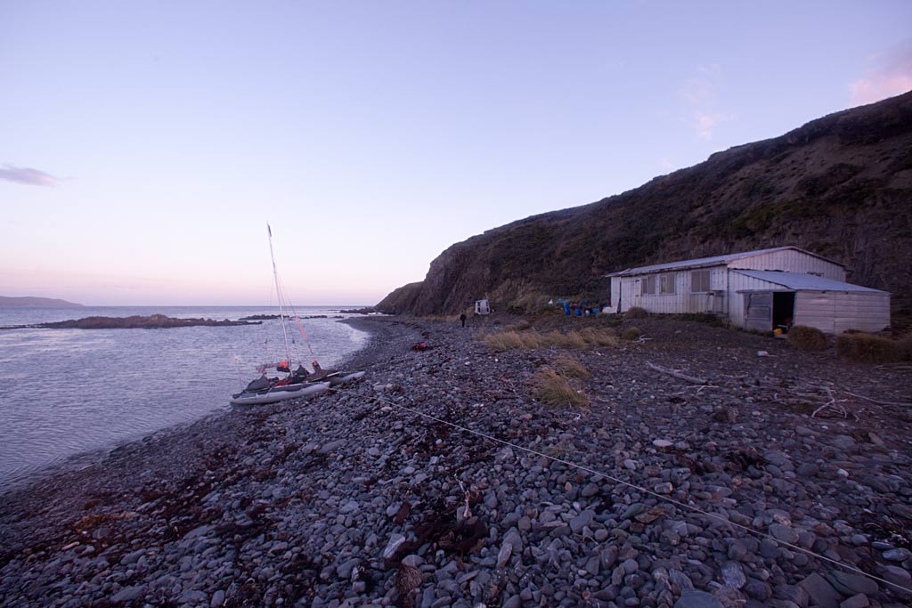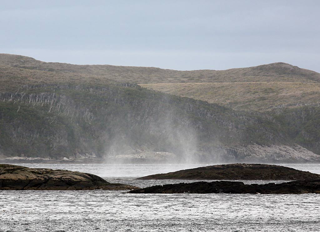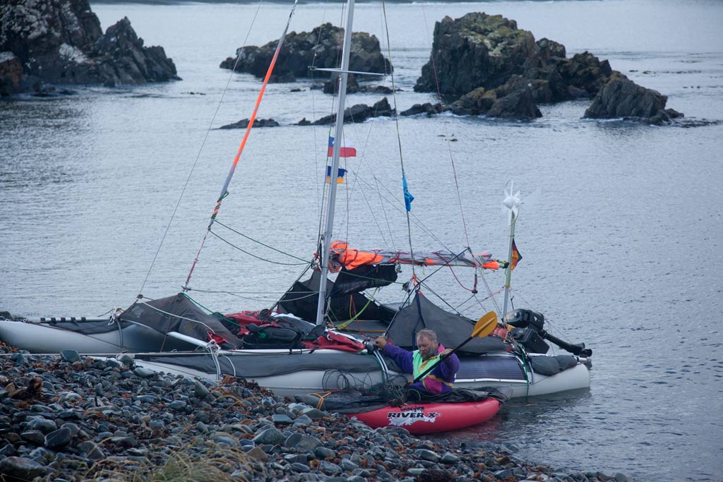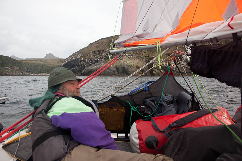 Было обидно, что мы не встали раньше и потеряли большой промежуток очень тихой погоды, за что вечером мы были наказаны. Катамаран продвигался вдоль берега на моторе. С гор на острове часто задувал ветер. Было холодно. Часа через полтора я замёрз и с ужасом думал о том, что пролив нам предстоит пересекать не меньше 6ти часов. По пути мы заехали посмотреть на поющие пещеры, которые я описывал в начале. Мы подъехали совсем близко и заглушили мотор. Было видно несколько входов в пещеру, дальше она представляла собой большой зал, в котором лежали морские котики или тюлени. Это они издавала эти воющие и ревущие звуки, а пещера их усиливала. Посмотрев немного, мы пошли дальше. Очень скоро мы вышли из-за острова, дальше предстояло идти около 40 км по открытому морю. Выйдя из-за острова, ветер изменился и стал дуть слабее и почти нам в спину. Подняв паруса, мы прибавили в скорости и на себе перестали чувствовать ветер. Волна была небольшая, временами выходило солнце. Стало теплее и веселее. Впереди на горизонте стояли тучи. Видно было, что из них идёт дождь. Мы понимали, что через какое-то время мы с ними встретимся и попадём под дождь, возможно, будет изменение ветра. Проехав примерно 2/3 пролива, мы попали под проливной дождь, видимость пропала, но солнце пробивалось сквозь тучи и подсвечивало море. Это длилось около нескольких минут, но цвета были невероятные. В то время мы проходили мимо небольшого островка, и когда его осветило солнце, то зрелище было совсем невероятное. На ближнем фоне мы видим воду, дальше оранжевый свет и над ним остров. Это была такая радуга. Дождь закончился, мы быстро продвигались к нашей стоянке. До конца пути оставалось около часа. Ветер стал усиливаться, волна росла. До острова оставалось около 1 км. Волна выросла, некоторые доходили до 2х метров в высоту. Ветер начал свистеть в фалах, появилось много пенных гребешков. Это начинался шторм. Мы уже шли вдоль острова Ленокс на расстоянии около 500-700 м,но подойти ближе и остановиться было негде. Нужно было идти до намеченной бухты. Становилось все страшней и страшней. Так мы шли вдоль острова около получаса. Впереди показалась нужная нам бухта, но заход в неё был непростой. На входе в неё было несколько камней, на которые обрушивались волны. Наш катамаран удачно проехал между камней, но водоросли мы зацепили. Слава Богу, они нам не доставили проблем, мотор не заглох, мы вошли под прикрытие бухты, здесь море было явно спокойней. Впереди на берегу мы увидели домик краболовов и хороший галечный пляж. Причалив, мы осмотрели домик и решили здесь остановиться. День был тяжелый, в этот день мы перебрались с архипелага Горн на остров Ленокс, преодолев пролив Нассау, около 40 км открытого океана, а под конец попали в начинающийся шторм. Все очень устали и за ужином решили, что следующий день будет днёвка.