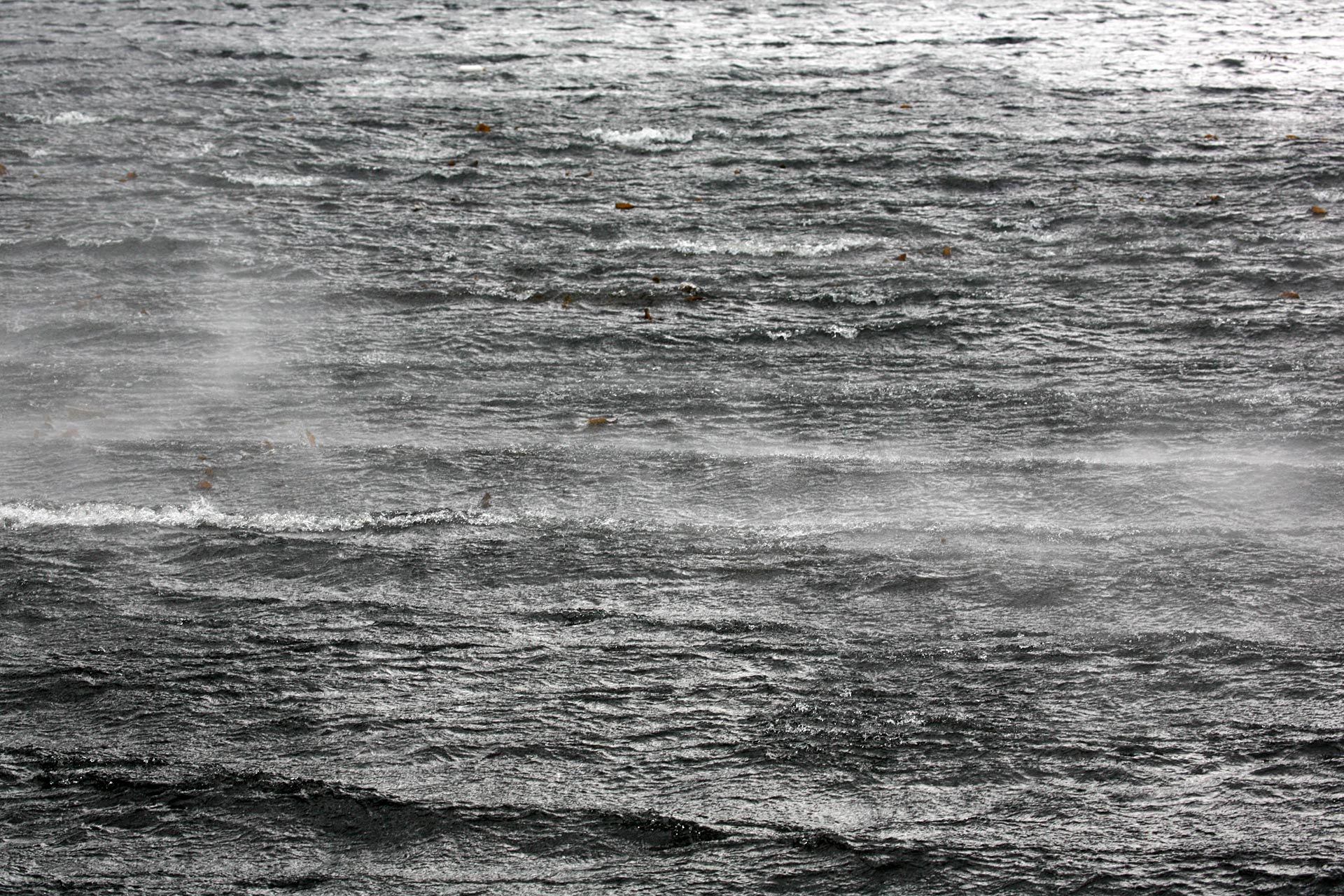 Вообще медицинские проблемы потихоньку накапливаются. У Жени и Марины проявилась странная алергия. У жени сильно, у Марины поменьше. Похоже это алергия на какие-то водоросли в воде в сочетании с солнечной погодой. Хорошо(?) что солнечных дней немного. Внешне это выглядит как водянки на внешней стороне пальцев и кистей рук. Сначала мелкие пузыри, затем они укрупняются, а потом лопаются. На месте остаётся рана как от ожога. Хорошо, что у меня в аптечке есть противоожоговые компресы с нанесённым металлически серебром. Ничто другое в условиях низких температур и постоянного макания в холодную морскую воду не помогает. Так что раз в один - два деня устраиваем жене перевязки. У Марины аллергия проявляется слабее, она обходится мазью. Супрастин не помогает, да и у нас его не так много, чтобы принимать постоянно. А кроме того я не знаю, можно ли его длительно принимать. Как бы не навредить больше. Ветер стекает со склонов струями. Иногда эти струи двигаются какое-то время параллельно поверхности воды. И вода в этом месте как бы вскипает.. Иногда бъют сверху, и тогда создаётся впечатление как будто гикантская щука ударила по косяку мелкой рыбёшки, и те бросились в рассыпную от хищника. Время от времени порывы долетают до нас и умывают морскими брызками. Я постоянно протираю оптику камер от брызг. Мои силиконовые самодельны боксы пока держат. Рассматриваю в бинокль пространство за выходом из бухты. Там сплошные маленькие смерчи. Бррр.
