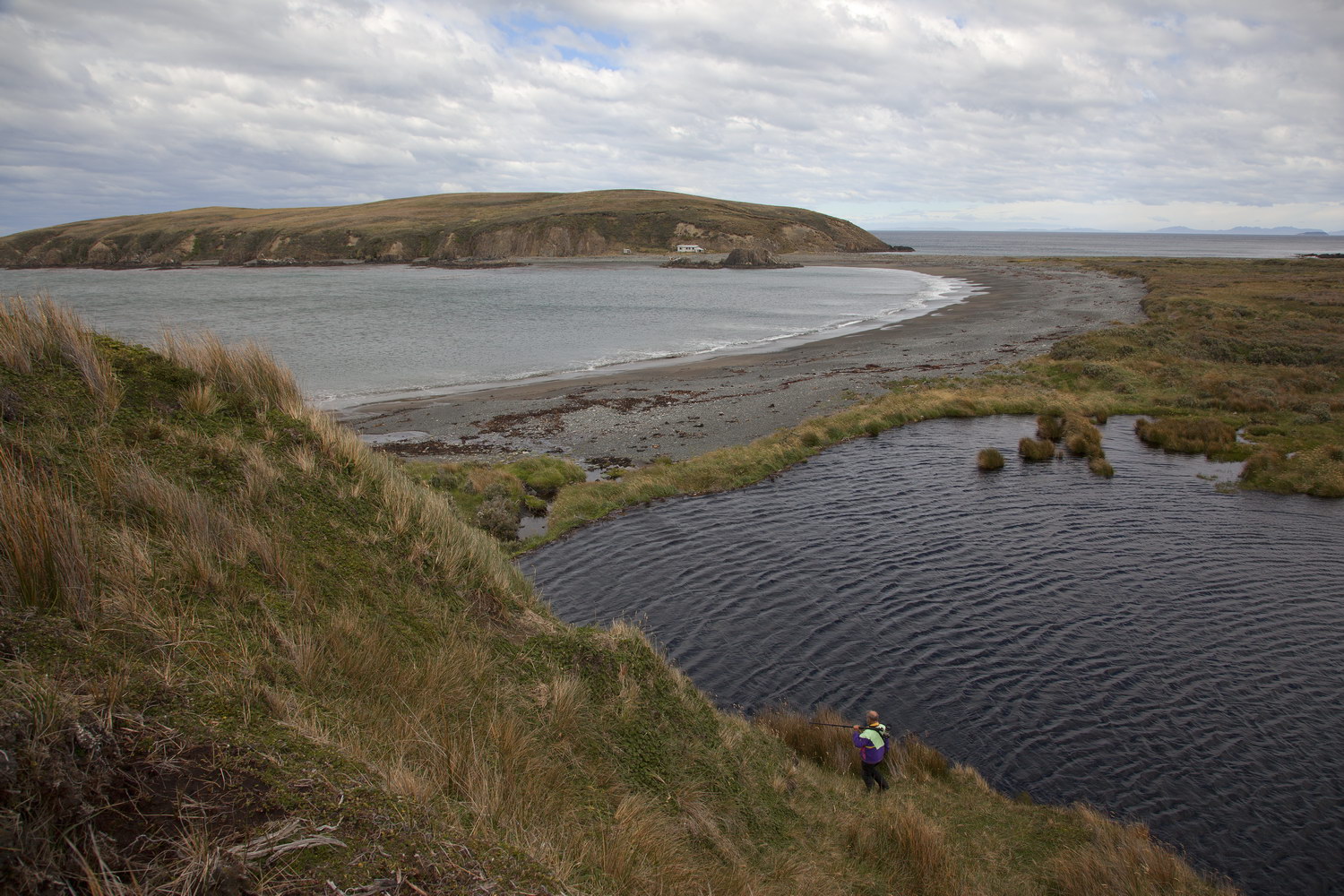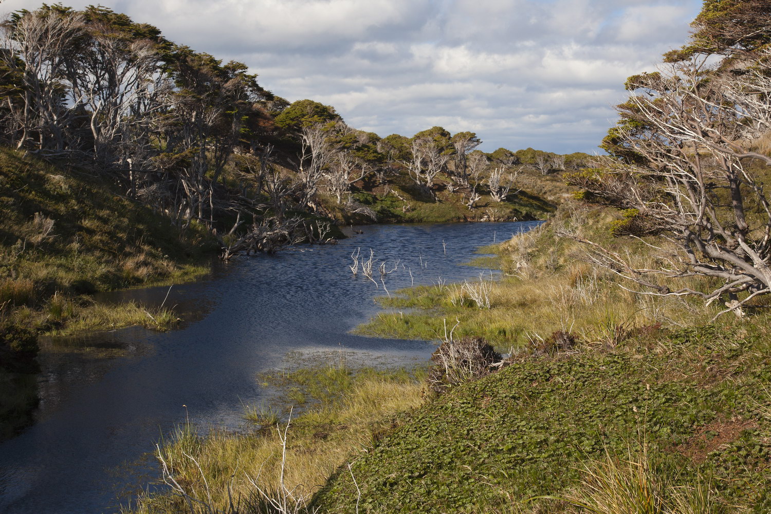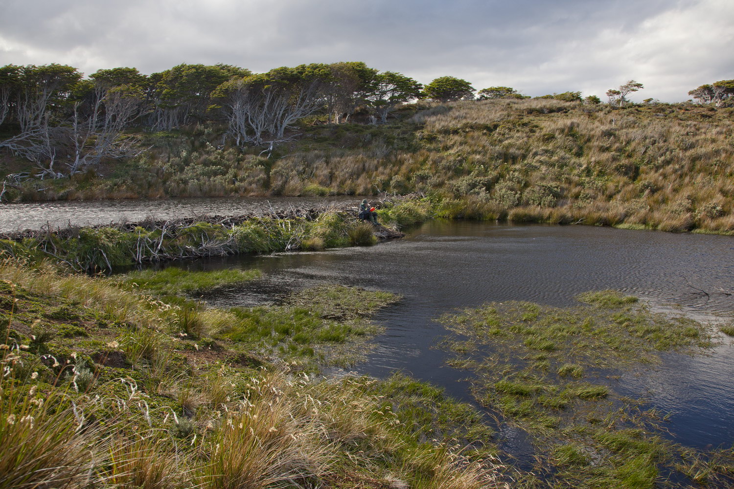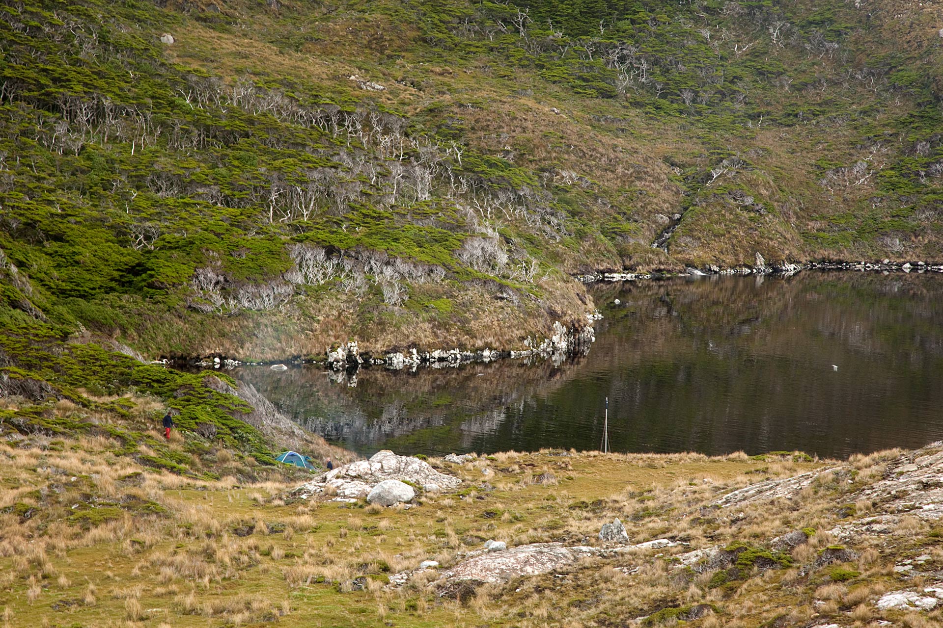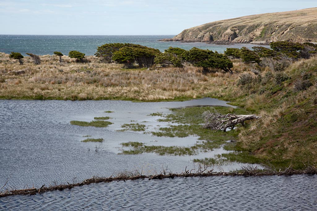 Место впадения не видно, но есть какое-то озерцо, отгороженное от пляжа как бы небольшой дамбой. Уровень озерца где-то на полтора, два метра выше уровня пляжа. В углу, под самой скалой, просачивающаяся вода образует мелкий ручеёк. Набирать воду тут неудобно, слишком мелко, да и кружку не взял с собой, растяпа. С трудом нахожу место где можно подняться на дамбочку, мешает колючий низкий кустарник. Вода в озере прозрачная, цвет определить не удасться, но думаю, что коричневатая, береа и дно озера похоже торфяные. Аккуратно, чтобы не взболтать грязь со дна, кладу канистру плашмя на воду, и жду пока она наполнится. Сам пока осматриваю озерцо. Такое ощущение, что дамба имеет искусственный характер. Но судя по растительности на ней, всё было сделанно очень давно. Канистра наполнилась. Закручиваю крышку, и сползаю вниз на пляж. Медленно иду по кромке пляжа, по плотному влажному песку обратно в сторону домика. Всё время оглядываю под ноги. Может что-либо интересное попадётся. Например по дороге сюда попался череп, похоже от гуанако, также видел несколько брошенных крабьих ловушек. Одну похоже можно будет восстановить. Беру это себе на заметку.