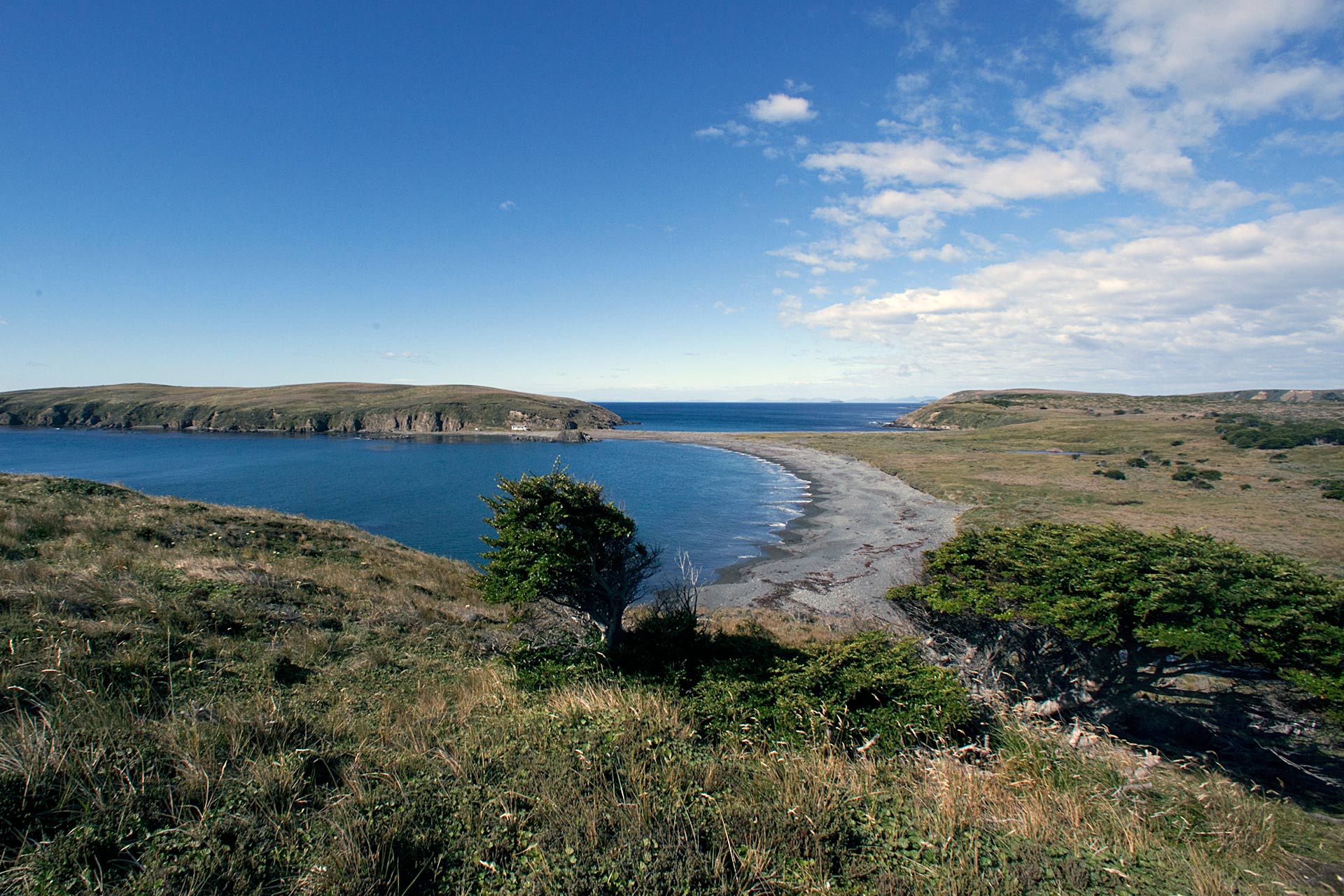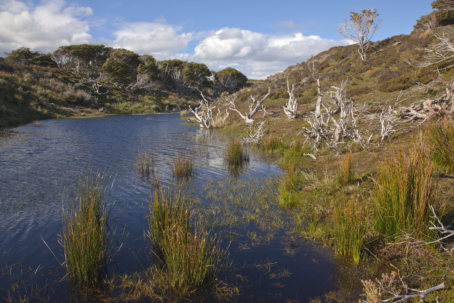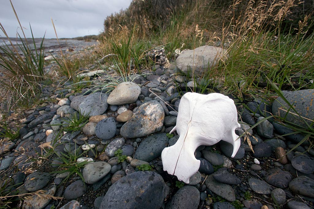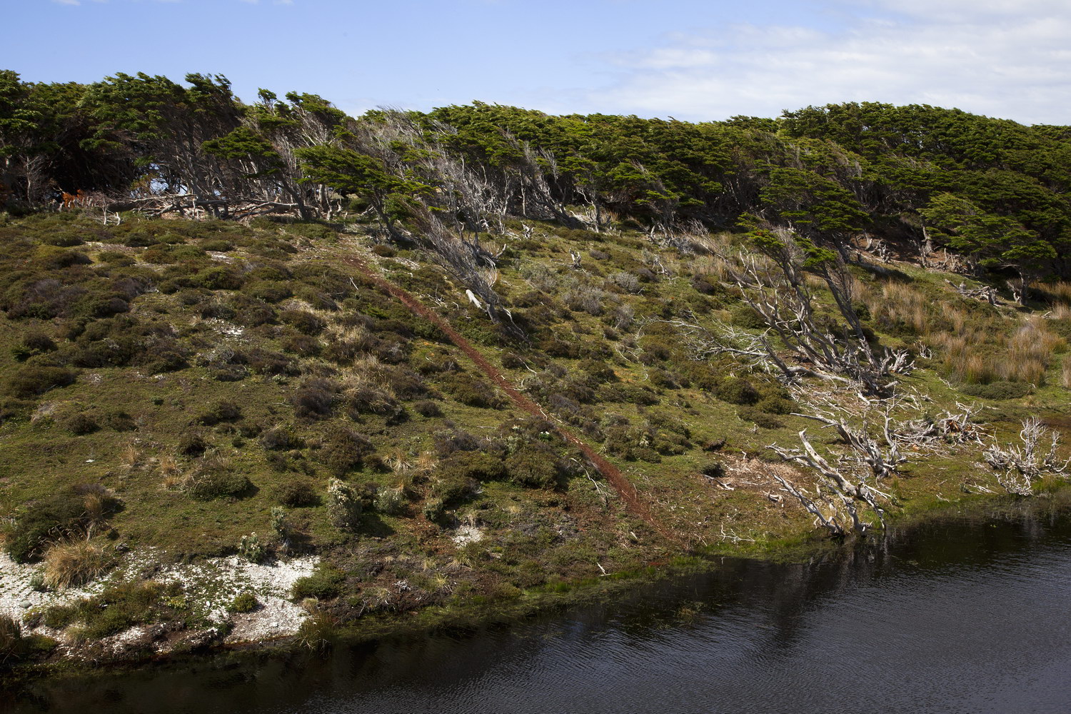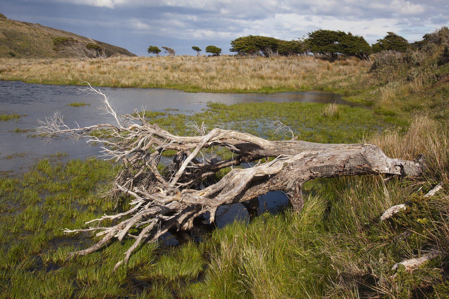 Место впадения не видно, но есть какое-то озерцо, отгороженное от пляжа как бы небольшой дамбой. Уровень озерца где-то на полтора, два метра выше уровня пляжа. В углу, под самой скалой, просачивающаяся вода образует мелкий ручеёк. Набирать воду тут неудобно, слишком мелко, да и кружку не взял с собой, растяпа. С трудом нахожу место где можно подняться на дамбочку, мешает колючий низкий кустарник. Вода в озере прозрачная, цвет определить не удасться, но думаю, что коричневатая, береа и дно озера похоже торфяные. Аккуратно, чтобы не взболтать грязь со дна, кладу канистру плашмя на воду, и жду пока она наполнится. Сам пока осматриваю озерцо. Такое ощущение, что дамба имеет искусственный характер. Но судя по растительности на ней, всё было сделанно очень давно. Канистра наполнилась. Закручиваю крышку, и сползаю вниз на пляж. Медленно иду по кромке пляжа, по плотному влажному песку обратно в сторону домика. Всё время оглядываю под ноги. Может что-либо интересное попадётся. Например по дороге сюда попался череп, похоже от гуанако, также видел несколько брошенных крабьих ловушек. Одну похоже можно будет восстановить. Беру это себе на заметку.