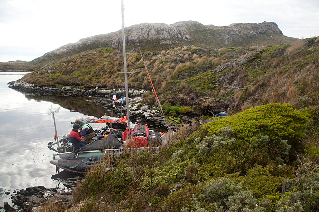 К обеду начинает светлеть. Облака поднимаются повыше, но ветер не прекращается. Марина уходит снимать. Костя берёт снасти и идёт ловить рыбу. Катушка уже полностью поломалась, но он сообразил новую донку. На острове Горн он откуда-то скомуниздил несколько больших ржавых гаек. Это немного получше чем т-образное соединение от водопроводной трубы в качестве грузила. Ветрогенератор гудит. Контроллер зарядки показывает, что всёзаряженно под завязку, и ветрогенератор работает сейчас в режими автоторможения. Меня намного смущат какая-то непонятная вибрация. Раворачиваю ветрогенератор плоскостью лопастей по ветру, чтобы он остановился. Это что ещё такое? В кольце соединяющих лопасти нет одного сегмента. Похоже ночью была такая скорость вращения, на которую конструкторы не расчитывали. Ну что же, нужно резать. Для сохранения балансировки выпиливаю другой сегмент кольца с противоположной стороны. Теперь главное всех предупредить чтобы были поосторожней в районе ветрагенератора. Может рубануть. Проверяю барометр, похоже начал ползти вверх. Это хорошо. Работаю с картой. Просчитываю различные варианты возвращения. Их два. Один по тому же пути как мы шли сюда, а другой через остров Ленокс и Пиктон. По расстоянию они почти одинаковы. Завтра посмотрим.