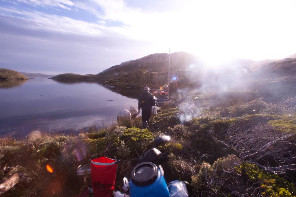 Вот и Женя с Мариной появились. Сегодня в планах жарка баурсаков. У нас есть ещё муки на пару раз. С позавчерашнего дня остались потроха рыб пойманных Костей. Заряжаем вершу, и Женя завозит её в окно водорослей. Вот и Костя выполз из палатки, и начал помогать в готовке. Он похоже не в настроении. Когда он взял топор, чтобы нарубить дров, я пошутил по поводу вчерашнего инцендента с палаткой. Он как-то сильно на это отреагировал. Пришлось пообещать, что больше шутить по этому поводу не будем. Косте последнии дни нездоровится. У него возобновилось кровотечение, и немного побаливает что-то внутри. Температуры вроде нет. Таблетки прописанные пьёт. Причём к концу днёвок у него всё проходит, а после ходовых дней он чувствует себя не очень. Я стараюсь не нагружать его ничем. Его здоровье для группы сейчас важнее, чем его помощь. Мы с ним ещё раньше договаривались, что если ему будет плохо, то чтобы сразу сказал. Но он и сам это понимает.