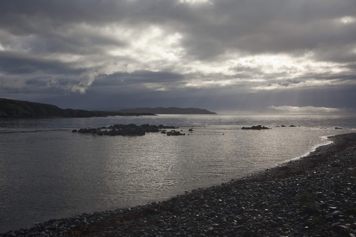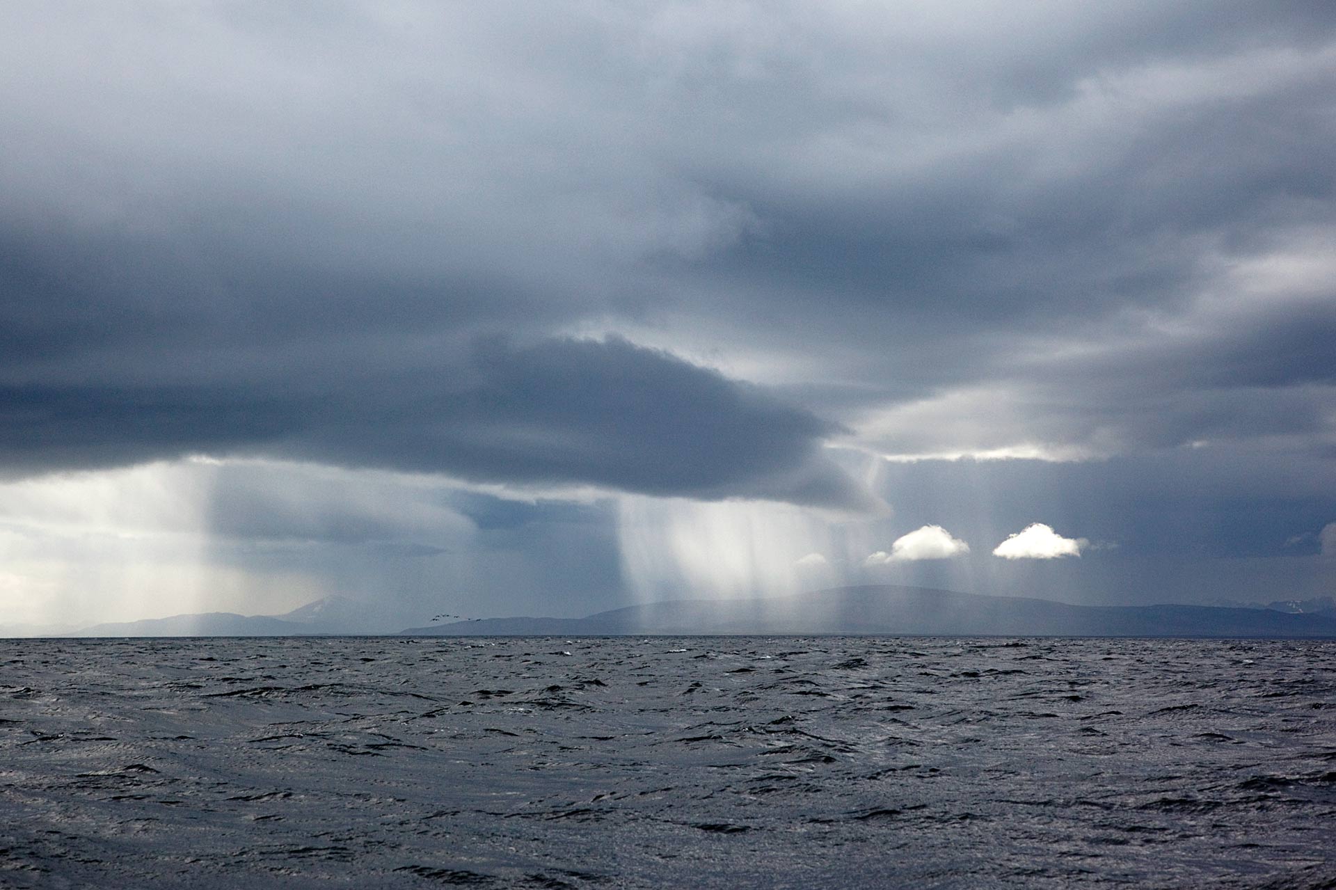 Погода всё время менялась, то солнышко, то тучи с дождём. В какой-то момен сложилась необыкновенная световая ситуация. Всё небо было укрыто облаками. Характерной особенностью (по крайней мере так было во время нашего плавания) облаков этом районе, является их низкая толщина. Они вроде и серые, но солнце их пробивает, и они как бы светятся изнутри. Что-то похожее я наблюдал в горах когда тебя накрывает облаком в ясную солнечную погоду. Но там пространство очень ограниченно, а тутсцена огрпничивается только горизонтом.