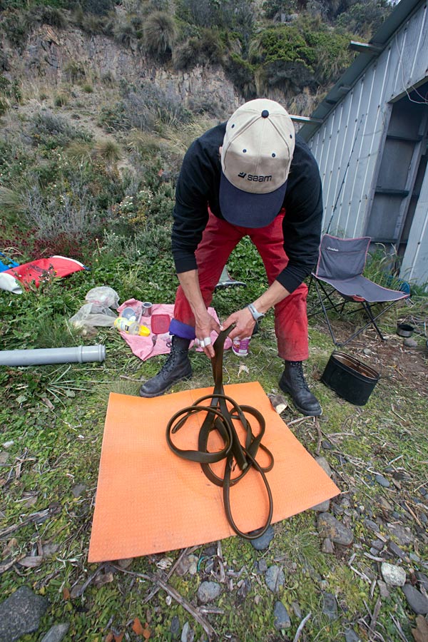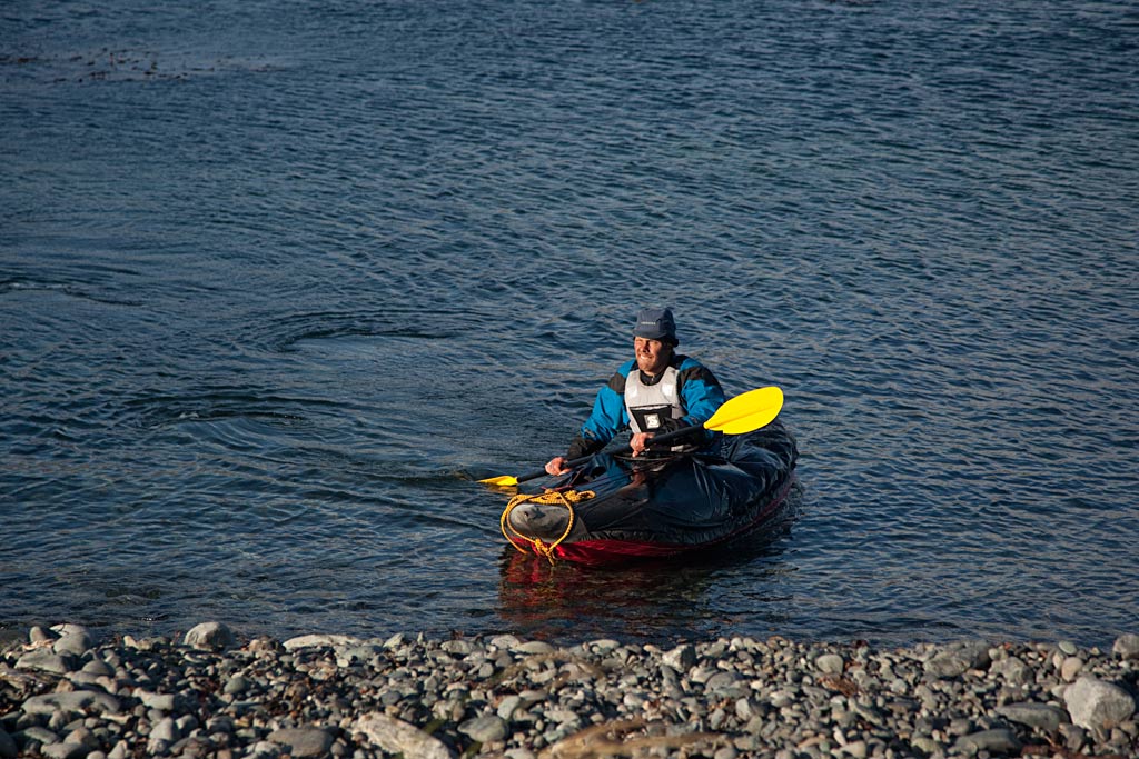 Кроме того начали возникать проблемы с буксируемой байдаркой. Дело в том, что когда у нас обломило первое перо руля, тогда же обломило плавник и у байдарки. Там был приделанный мною плавник от виндсёрфинга. Байдарка у меня рафтинговая и без плавника она не лежит на курсе. плавник обломался и блогополучно утонул. Я соорудил некое подобие плавника, даже не плавника, а нечто такое, что повысит курсовую устойчивость байдарки, из остатков от двух телескопических палок для хождения по горам. До этого момента это работало, но тут стабилизации оказалось недостаточно. В какой-то момент байдарку перевернуло, но тут же, следующая волна вернула её в нормальное положение. Такое неприятное хождение длилось около часа. В конце скального участка был мыс и несколько островов. https://maps.google.de/?ll=-55.337444,- ... 8&t=h&z=15 Справа, мористее от острова было видно как окенская зыбь образует высокие обрушивающиеся валы. Вот где сефингистам раздолье. слева, между мысом и островками тоже было неприятно, там был сулой, правда просматривался и небольшой участок поспокойнее. Похоже там было поглубже. Уже никто не снимал. Все сидели тихо как зайчики. Ну вот и проход, пару сотен метров толчеи, и мы можем уйти за мыс в бухту. У меня на карте было отмечено две-три возможных стоянки. В этой бухте была первая. Заходим в глубь бухты. Тут тихо. Под скалой притулился какой-то одноэтажный дом. Похоже что не жилой. Решаем причалить около него и осмотреться. Причалили, да нежилой, и в существенно лучшем состоянии чем предыдущий около Горна. Похоже это дом ловцов крабов, поскольку рядом мы видим много брошенных крабьих ловушек. Дверь открыта, несколько стекол не хватает, но вполне прилично. Разгружаем катамаран. Я разделываю утреннюю рыбу. Потроха опять идут в вершу, и Женя завозит её на кромку водорослей. Я беру камеру и иду снимать.
