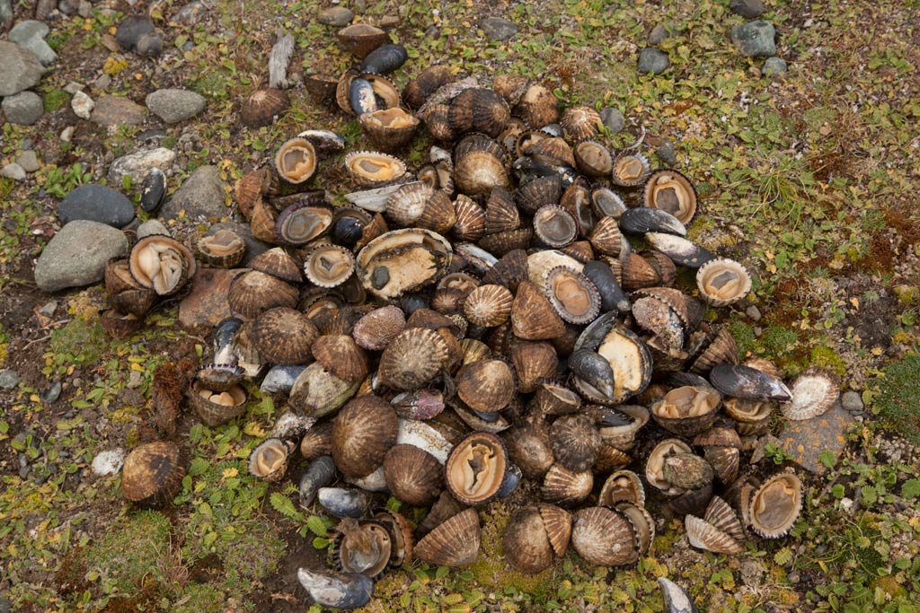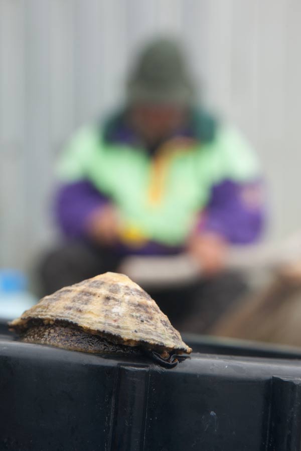 Эдик с Женей нарезали гигантских водорослей, длинных лентообразных частей их листьев. Вот их и нажарили. Неплохая добавка к рису. Но, как говорят в одном известном фильме, «хрену к ним не хватает». ))) Или хотя бы томату. Но мне, вообще-то, понравилось. Все больше в рационе мы пытались использовать подножный корм. Эдуард написал, что очередной раз мы насобирали мидий и конусообразных моллюсков, сделали тест, и, о, чудо, токсинов в конусных ракушках нет. И мы нажарили их полную сковородку. Они крупные такие, похожие на маленький овальный бутербродик: толстая мышечная подошва и сверху круглая печенка. Потом решили сделать еще один тест из уже жареных. И он показал наличие токсинов. Но, поразмыслив, что второй тест был некорректно сделан (ведь надо из сырых делать), Эдик решился попробовать и съел пару штук, подождал, потом еще съел и еще и еще. Попробовала и я. Вкусно, только чуть пережаренные получились, жестковатые. Так, к следующему утру мы вдвоем их практически приговорили. ))) Женя с Костей, по-моему, так их и не попробовали. Зато не подвергались риску. )))