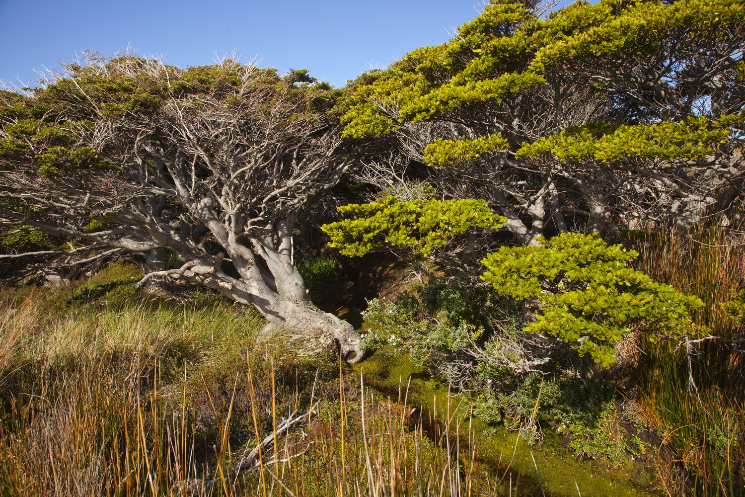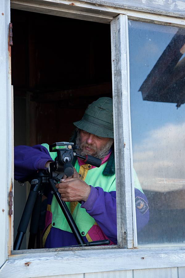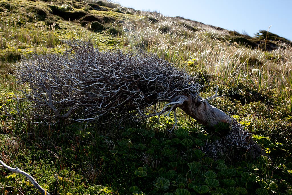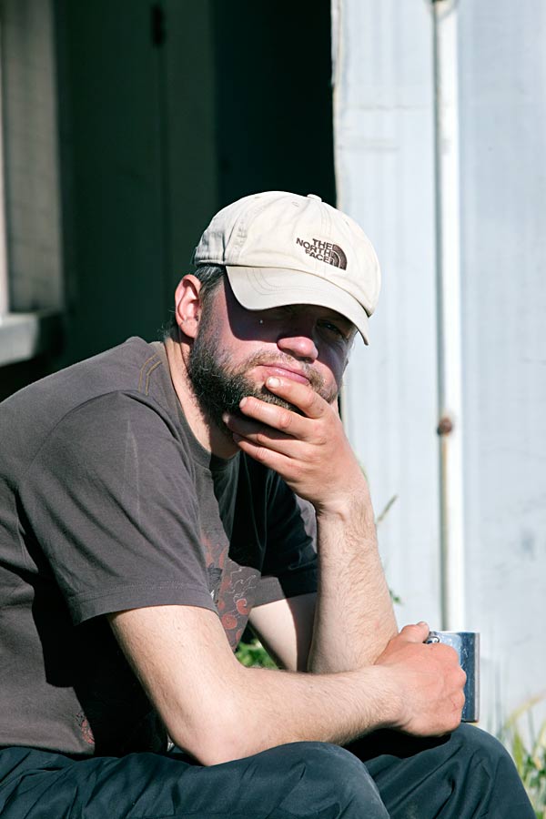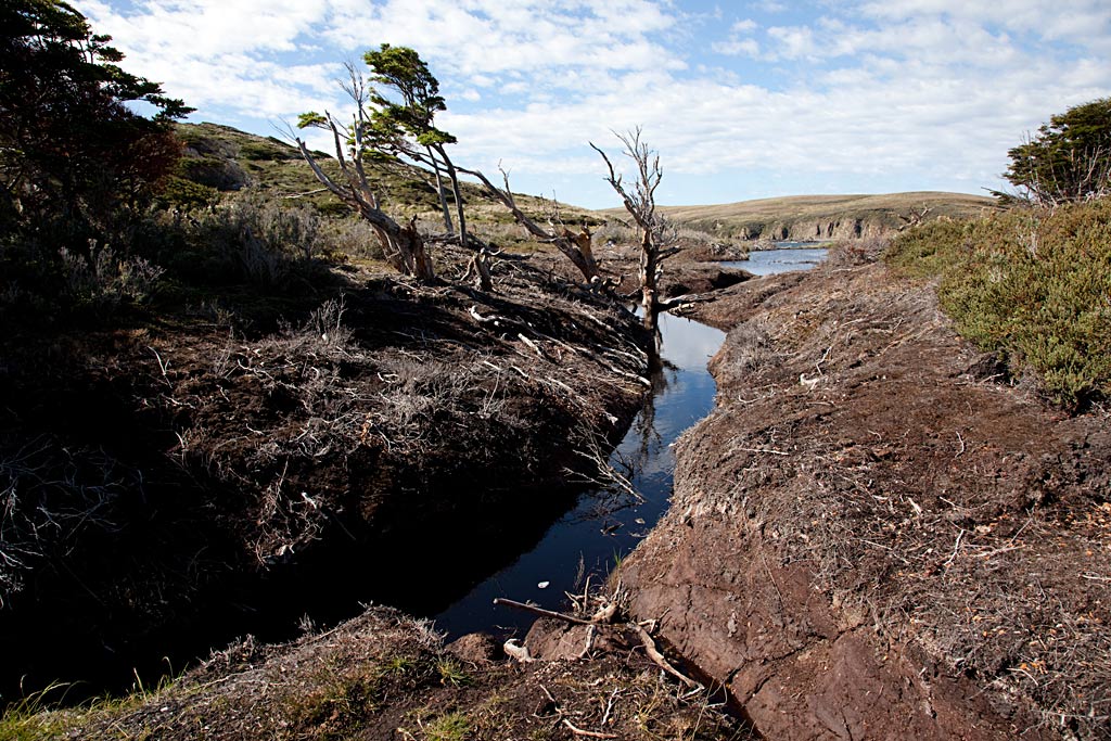 И мы пошли бродить по округе. Крученые стволы деревьев однозначно указывают на преобладающее направление ветров. На открытых местах деревья имеют вид кустарников, и только в прикрытых от ветра понижениях они вырастают во всю силу, имеют крепкие толстые стволы. К великой радости вечных грызунов, которых здесь водится великое множество. Это я о бобрах. В этой местности у них нет никаких врагов и они властвуют безоглядно. Даже на высоких местах попадаются почиканные стволы, как заточенные топором колья. А маленький ручеек превращен ими в каскад прудов. Высота плотин доходит до полутора метров. Плотины уже старые, поросшие травой. По ним можно ходить. Эдуард рыбачил с такой.