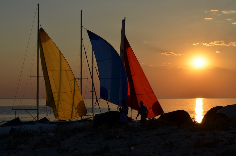 03.08.2013 Сбор команд был назначен в пос. Орловка. Мы – четыре экипажа из Киева: «Песец», «Пепелац», «Победа» и «Шкода», благополучно добрались до базового лагеря вечером, 3 августа. Погода была не жаркой, обычный вечер на берегу моря не обещал никаких сюрпризов. Те, кто приехал раньше уже успели собрать свои катамараны или находились в процессе. Нам, после дороги, заниматься сборкой было лень, тем более, что завтра был целый день, предназначенный для этого. Так, немного посидев, мы разошлись по палаткам, сморенные поездкой. Ночью меня разбудил несильный дождь. Ветер был также не сильный, одним словом ничего необычного. Я уже было приготовился снова уснуть, но дождь начал набирать обороты. Появилась мысль пойти обтянуть палатку, на случай, если дождь будет сильным и затяжным, но сделать этого я не успел. Вместе с дождём усилился и ветер. Налетел шквал. Силу ветра, сидя в палатке оценивать сложно, но учитывая нашу ветроустойчивую палатку, ветер был сильным. Капли дождя ударяясь в палатку, пробивали ткань, и внутри палатки стояла мелкая водная пыль. Ветер пытался сложить палатку и было опасение, что её может сдуть вместе с нами. Несколько порывов было особо яростных. Длилось это безобразие 15-20 минут. Как только ветер с дождём стихли, удалось выбраться наружу, чтобы как следует раскрепить палатку. Первая мысль, которая меня посетила, когда я выбрался из палатки, была – А что здесь делает этот катамаран?! Рядом с нашей палаткой, немного придавив соседнюю, лежала на боку «Синильга» (Даки17). Дело в том, что вечером она стояла метрах в десяти, в стороне. Сила ветра была такой, что её оказалось достаточно, чтобы сдуть с берега катамаран без парусов. Повезло, что пролетев, он не раздавил ни одну из палаток. Причём, его мачта уже была в тамбуре одной из палаток. При первичном осмотре катамаран выглядел целым. Как оказалось позже, улетели все три собранных на тот момент, катамарана. Ещё один катамаран самостоятельной постройки, в процессе кульбитов сломал мачту. Больше всего шороху навёл катамаран «Рассвет» (Даки17). Сначала, он влетел в припаркованный легковой мерседес, разбив ему лобовое стекло, слегка помяв и распилив вантой переднюю стойку. А затем, перевернувшись через мачту, упал на палатки. Чудо, что никто из людей сильно не пострадал. Беглый осмотр катамарана оптимизма не внушал: согнутая в дугу мачта, отломан один из кронштейнов крепления рулевой коробки, деформирована сама рулевая коробка, пострадала краспица. Оттащив катамаран с палатки, решили заняться ремонтом утром. Вернувшись к своим палаткам, уже собирались лечь спать, как вдруг, к нам подошёл мужик со швертом от «Удачи» с вопросом: Ребята, это не ваше? К слову, это доска, длиной около 2 метров. Он его нашел валяющимся, на дороге, за лагерем. Шверт, вечером оставили на трамплине катамарана. Шквалом его сдуло и он пролетел метров 30 над лагерем. Чудеса да и только. Тем временем ветер скис совсем, на небе мирно сияли звёзды и ничто не напоминало о пережитом.