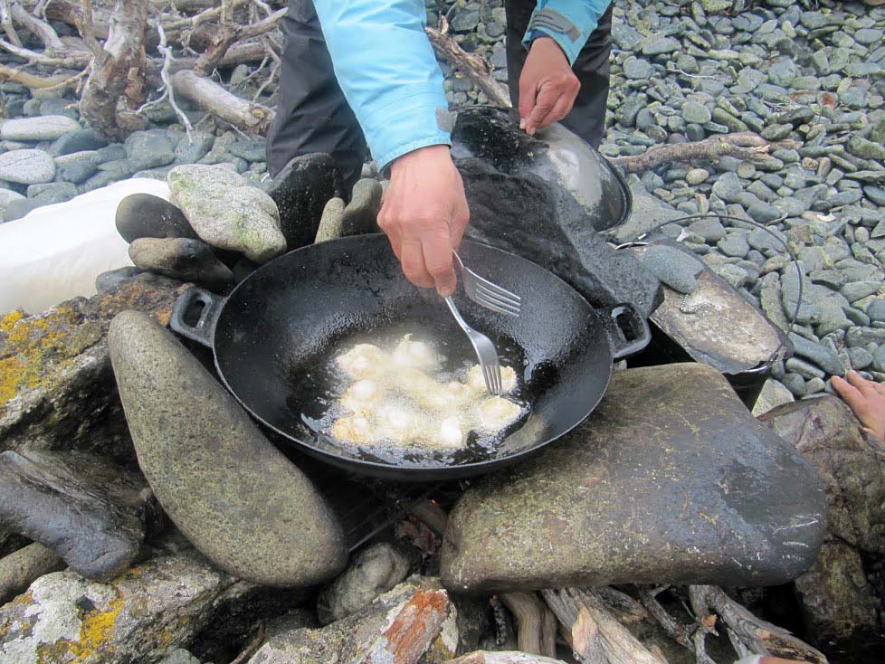 Буканов писал(а):8й день. Ночь прошла спокойно, прилив был меньше и нам не угрожал. Подъём был очень ранний – в 5.00. Было холодно, шел моросящий дождь. Прилив только отходил. Поэтому из палатки выходить пришлось босиком и одеваться на сухом месте снаружи. Мы быстро собирались, сразу одели сплавную одежду. На завтрак был только кофе, чтобы не тратить время, а как можно быстрее двигаться, пока не поднялся сильный ветер. Ведь из-за острова мы увидели, что погода не такая спокойная, как мы предполагали, дул встречный ветер, шел дождь, было холодно. Когда дует встречный ветер – брызги, созданные носами катамарана, часто попадают на экипаж, от этого становилось ещё холодней. По дороге к нам подплыли несколько дельфинов, недолго сопровождали нас и исчезли. Через два часа пути мы увидели вдали остров Горн. Он находится на расстоянии примерно 6 км от крайней точки острова « о» который прикрывает нас от океанской волны. Эдик решает высунуться из-за острова и посмотреть, что делается в открытом океане. Когда мы туда высунулись, то увидели большую волну, встречный ветер, мрачное небо, плюс то, что были мокрые и замерзшие. Ехать дольше было некомфортно. Капитан принимает решение повернуть обратно за мыс и подождать улучшение погоды. Спрятавшись за мыс, мы остановились на пляжике из булыжников, метрах в 30 от берега на горе стоял брошенный домик. Мы туда забрались, переоделись, приготовили завтрак, было уже около 11.00, поели – и сразу стало веселей.