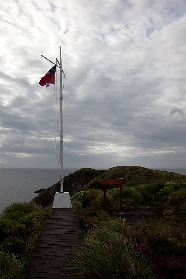Выходим из часовенки, деревянный тротуар ведет в маяк, сбоку отходит небольшой аппендикс с флагштоку с чилийским флагом.