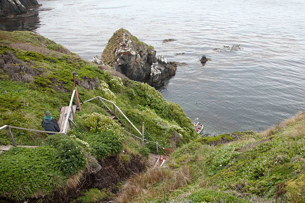 Погода странная, дует балла 3-4, низкие облака. Ниже нас по ветру мощные низкие тучи, и похоже проливной дождь. Над самим мысом Горн вроде просвет. Тьфу, тьфу, тфу, чтоб не сглазить. Слева по курсу между двумя островами выплывает гигантский лайнер и движется медленно по дуге в нашем направлении. Ребята начинают нервничать. Беру пеленг, объясняю команде что я делаю. Похоже он проходит у нас по корме. С достаточно большим запасом. На всякий случай контролирую его визуально и по АИС на радиостанции на псевдорадаре. Да по корме. Лайнер обходит нас по корме и начинает поворачивать к Мысу Горн. Похоже мы идём к одной и той же точке причаливания. Плубы с нашей стороны чрны от зрителей. Видны вспышки блитцев на фотоеамерах. Лайнер развернулся носом против ветра и лёг в дрейф. Нужно успедь переде тем, как они начнут высаживать туристов на надувнушках. Хочется поснимать остров без толпы. Там ведь несколько тысяч народа. На этих палубах. Да и бухточка около лестницы по описаниям маловата. Того и гляди не протолкнёшься. Я связываюсь со станцией наблюдения на острове, и прошу разрешения на посещение. Получаю. Под самым островом ветер затих. Опять заводим мотор и идём вдоль скал, огибая островки водорослей. Заходим в бухту. Положив в метрах 70 ти от берега якорь, чтобы в случае чего можно было оттянуться.