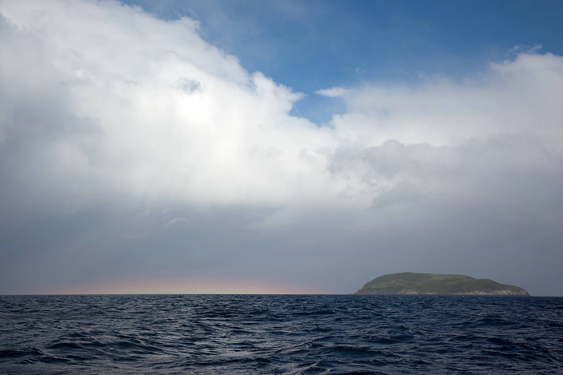 Погода всё время менялась, то солнышко, то тучи с дождём. В какой-то момен сложилась необыкновенная световая ситуация. Всё небо было укрыто облаками. Характерной особенностью (по крайней мере так было во время нашего плавания) облаков этом районе, является их низкая толщина. Они вроде и серые, но солнце их пробивает, и они как бы светятся изнутри. Что-то похожее я наблюдал в горах когда тебя накрывает облаком в ясную солнечную погоду. Но там пространство очень ограниченно, а тутсцена огрпничивается только горизонтом.