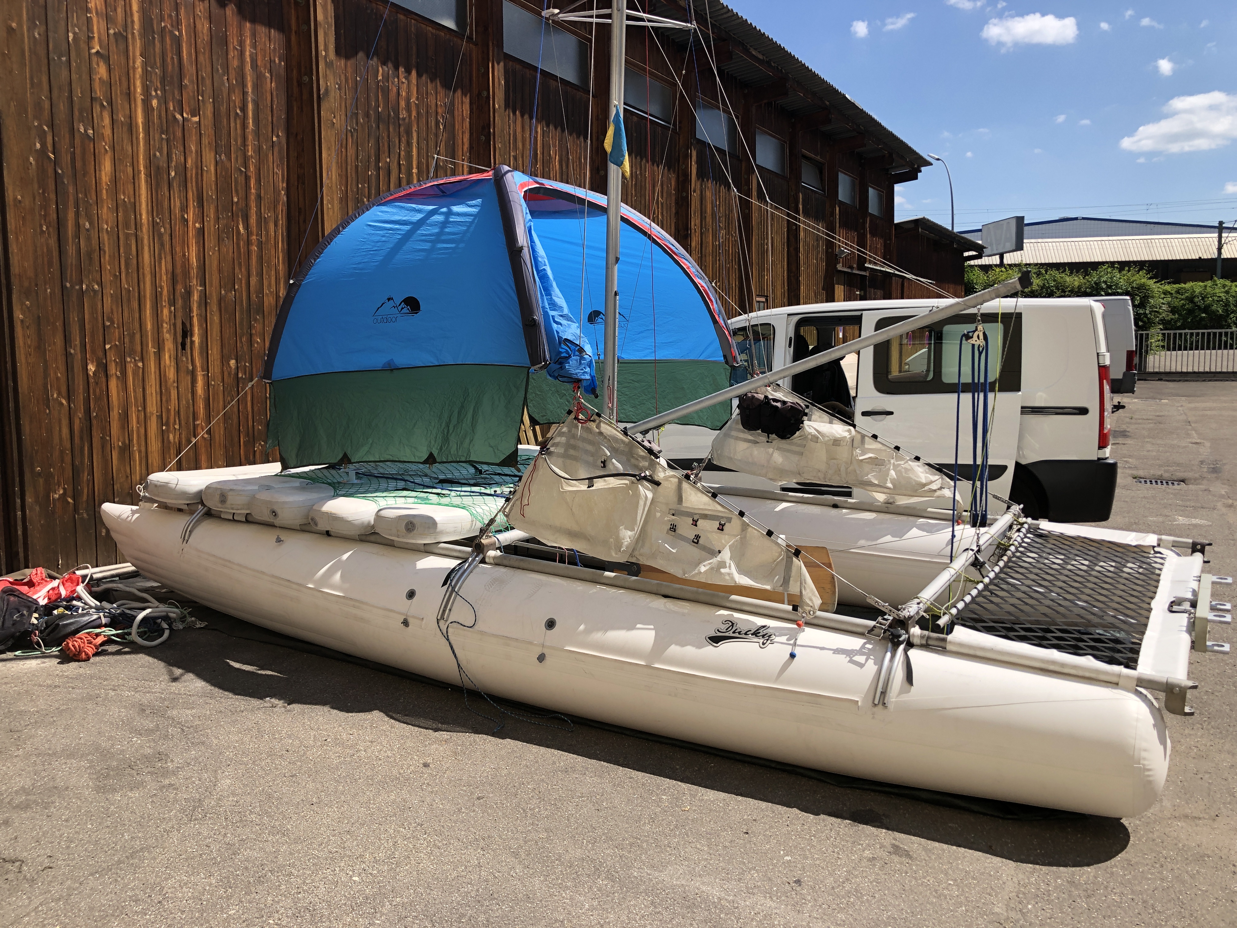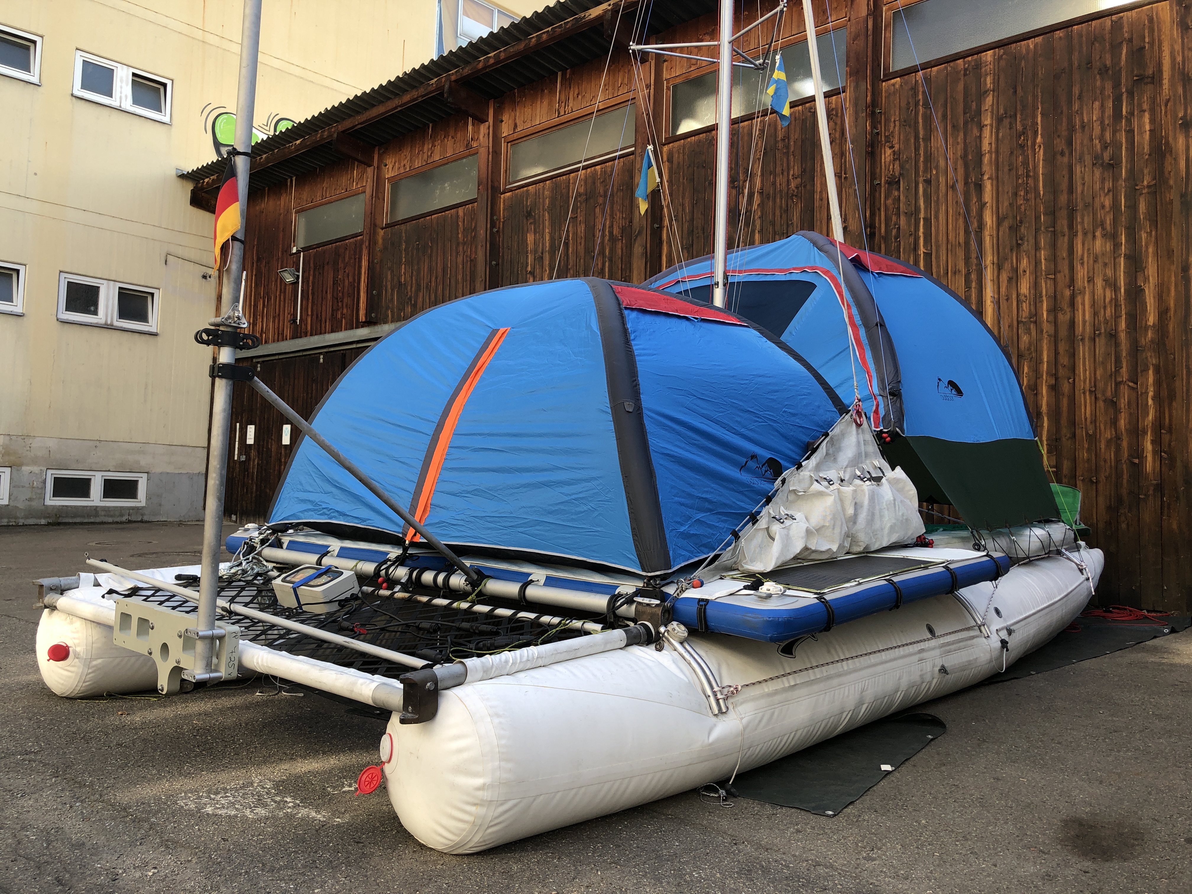 Две надувные палатки. Передняя без внутренней. Закрывает груз и даёт возможность приготовить еду, и сложить мокрую одежду на длительных стоянках в непогоду на якоре. Могут быть установлены на берегу