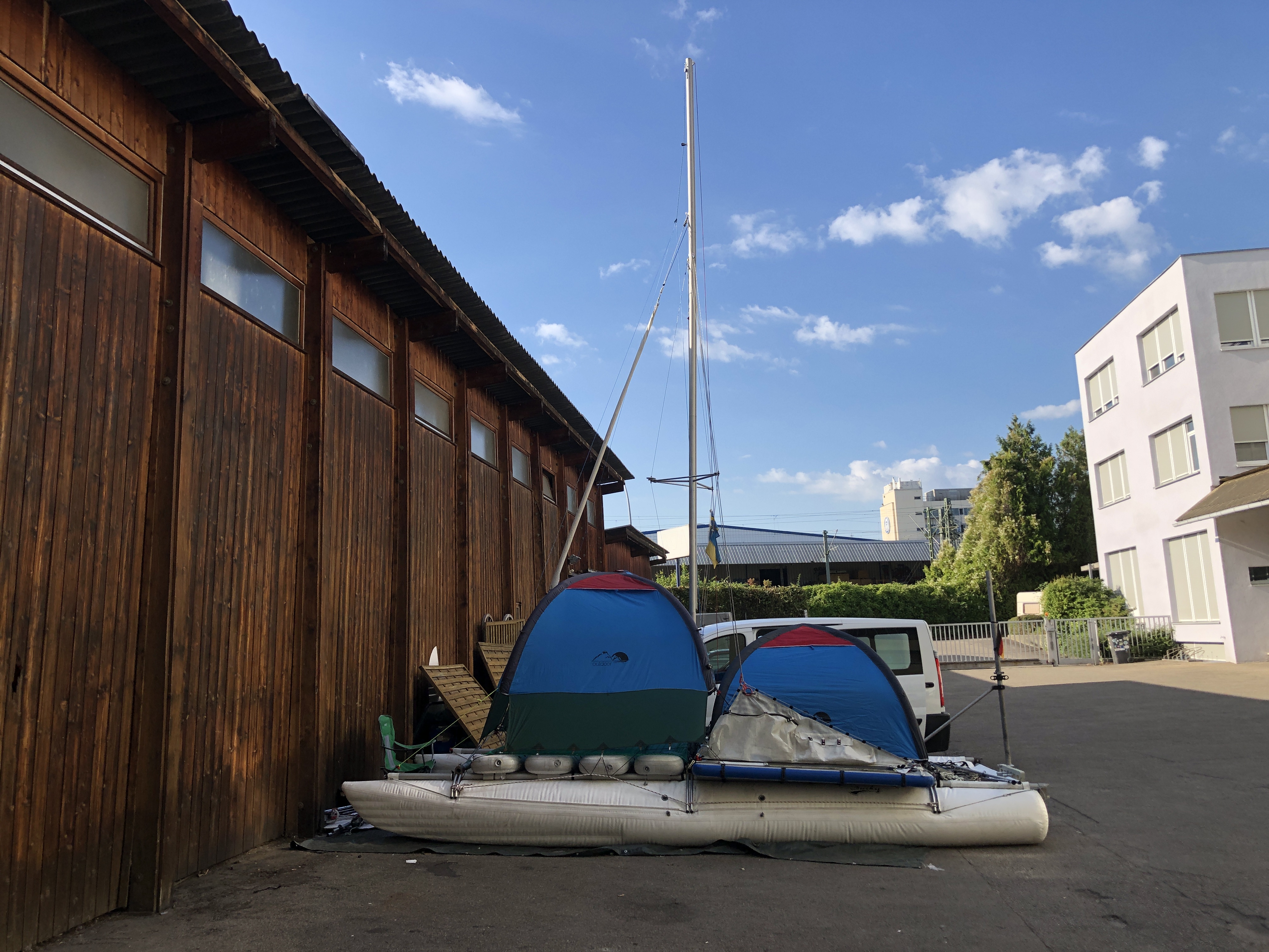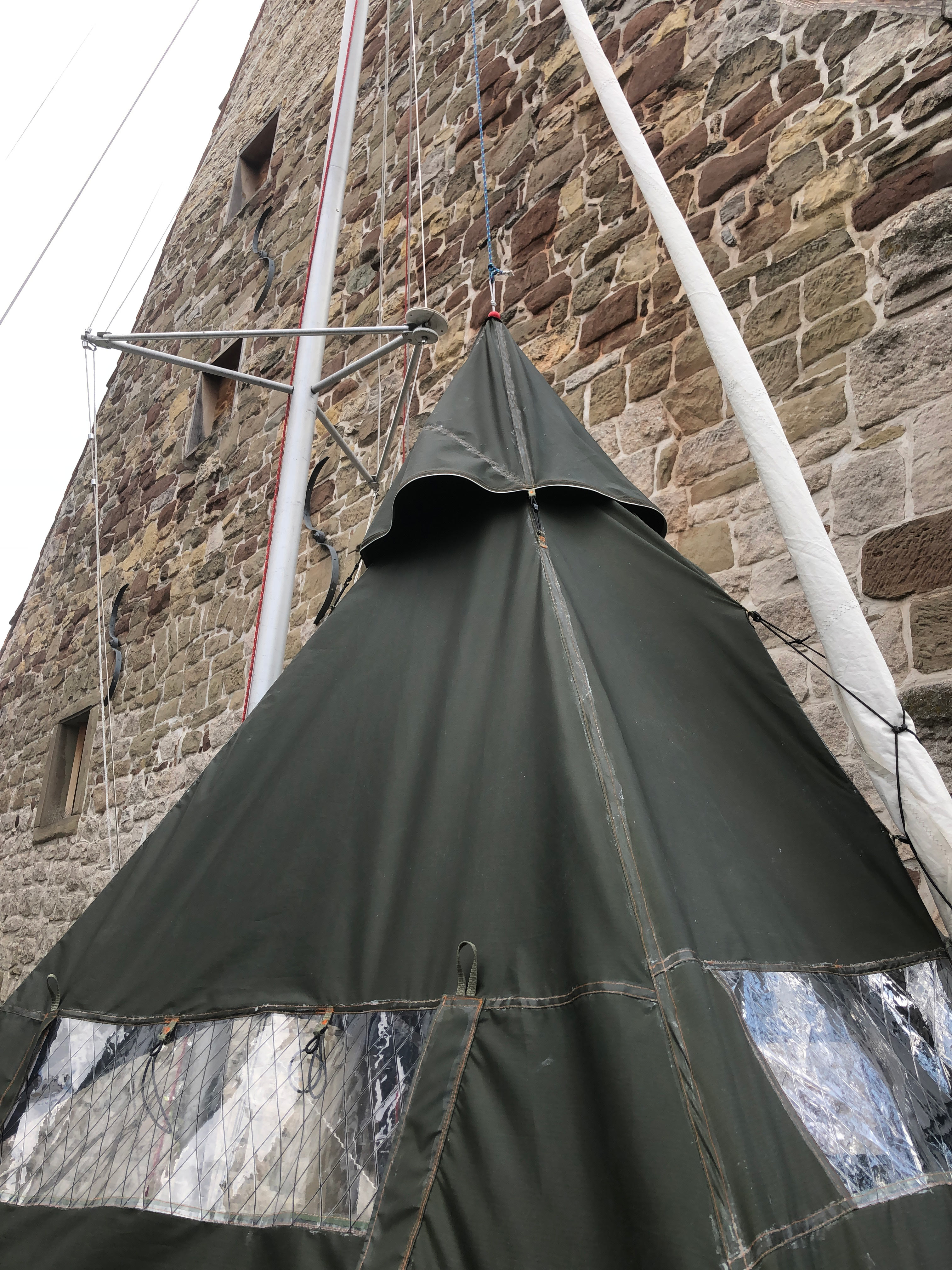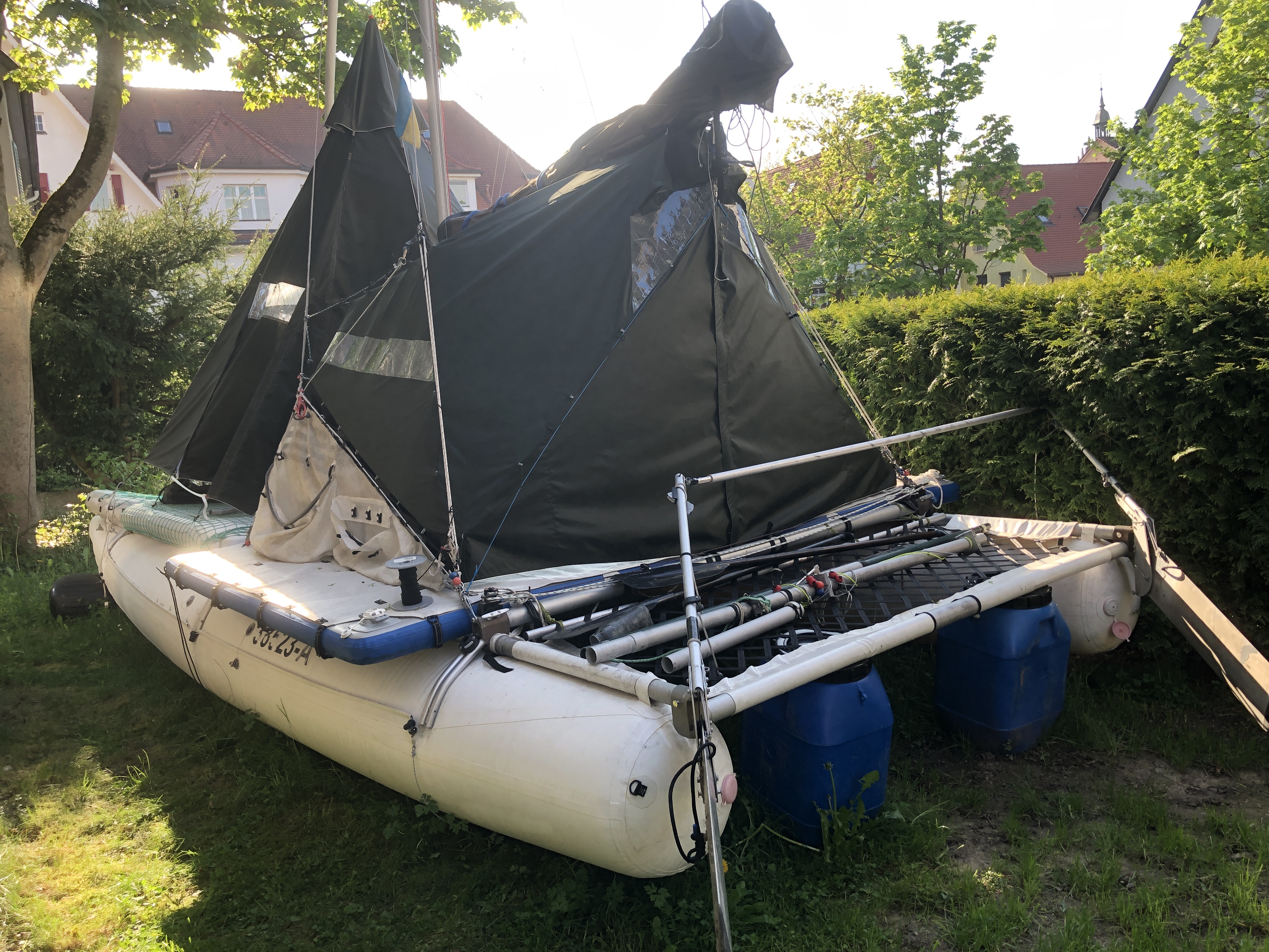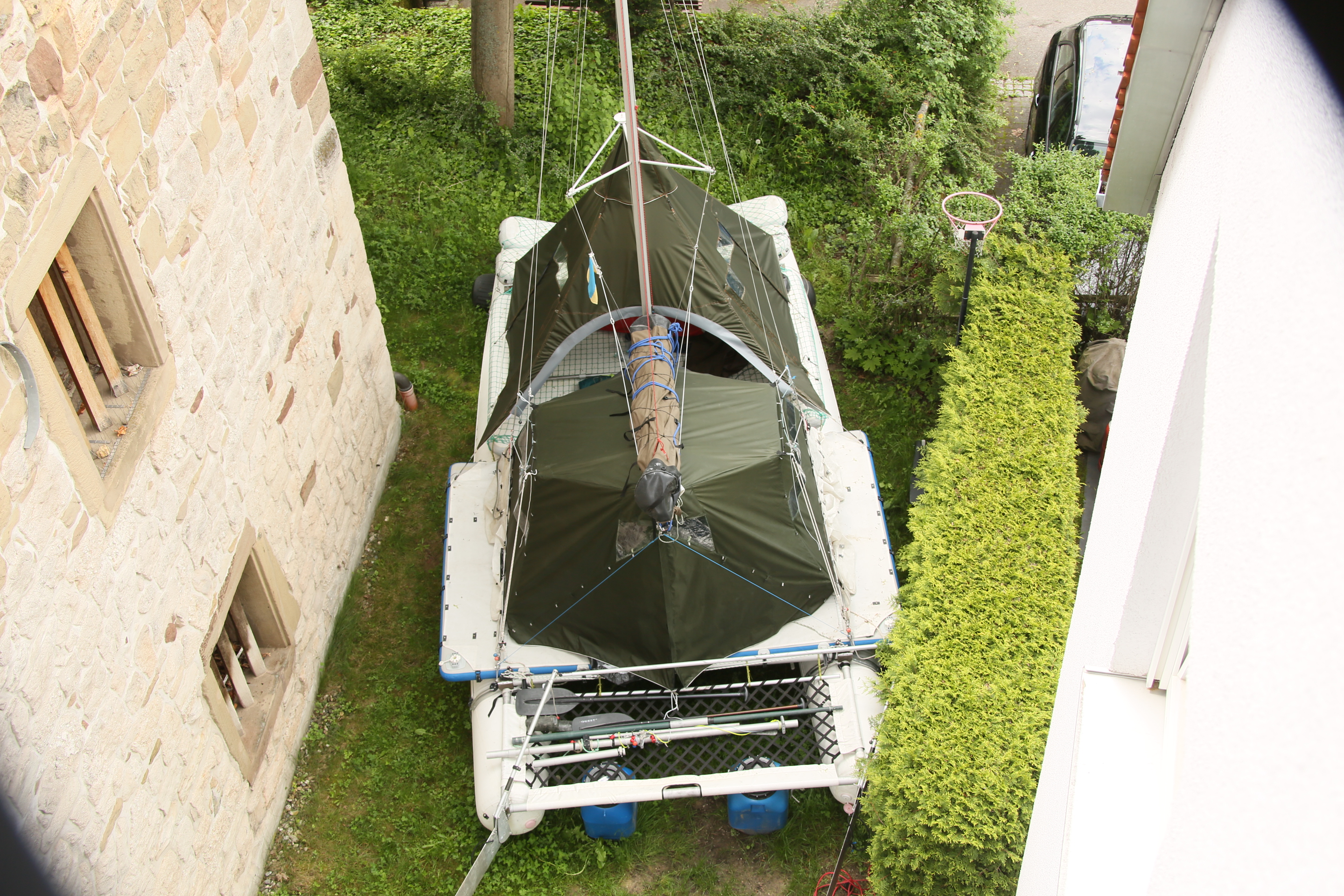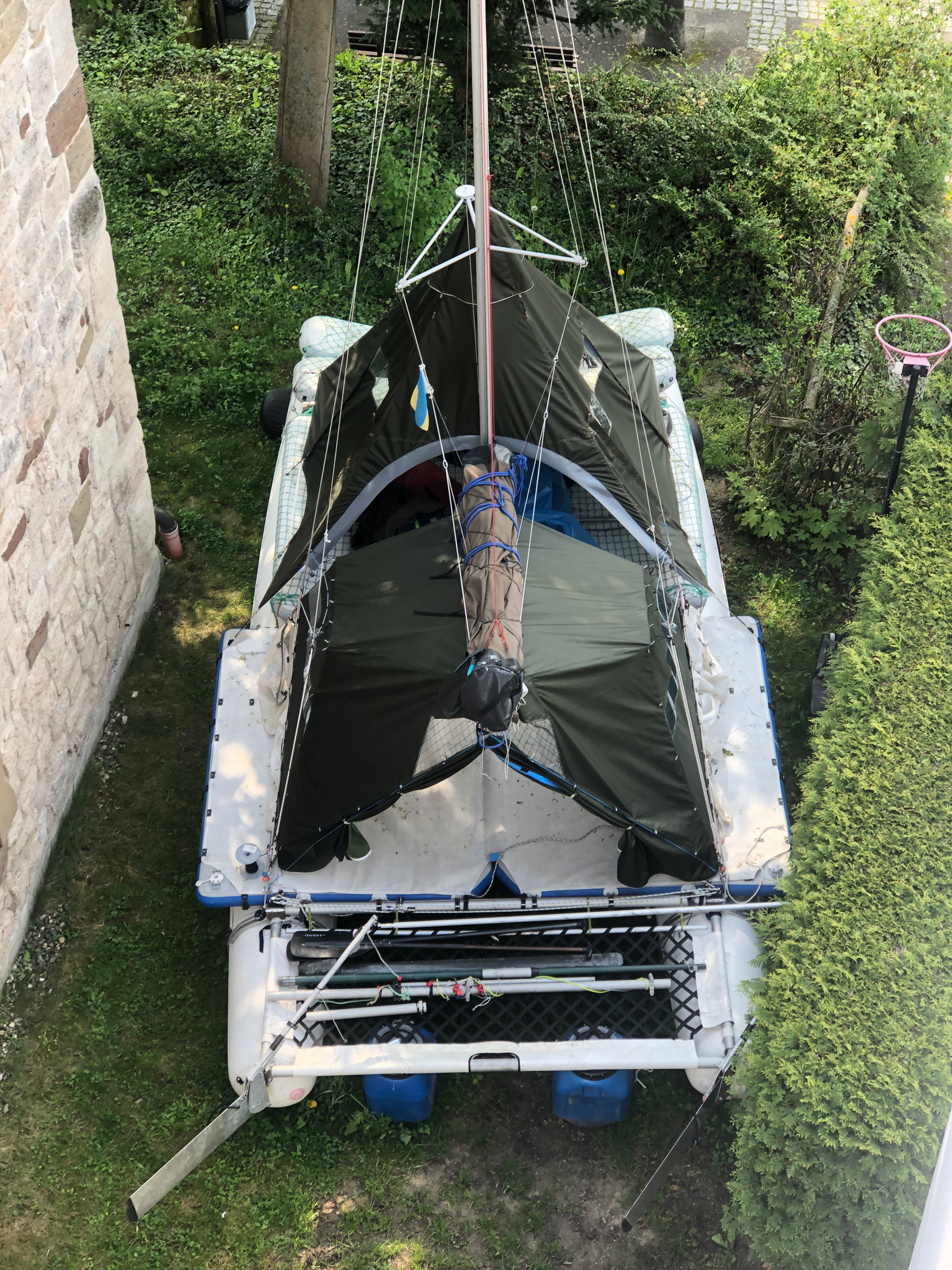 Решил увеличить высоту хозяйственной палатки на грузовом трамплине. Дошил по трем сторонам по 50 см 45 гр/м2 силиконизированый рипстоп. Поднимается на генакерном фале. Теперь в ней можно стоять в полный рост, это в тихом месте, и(или) можно опустить до палубы при неблагоприятных ветровых условиях.