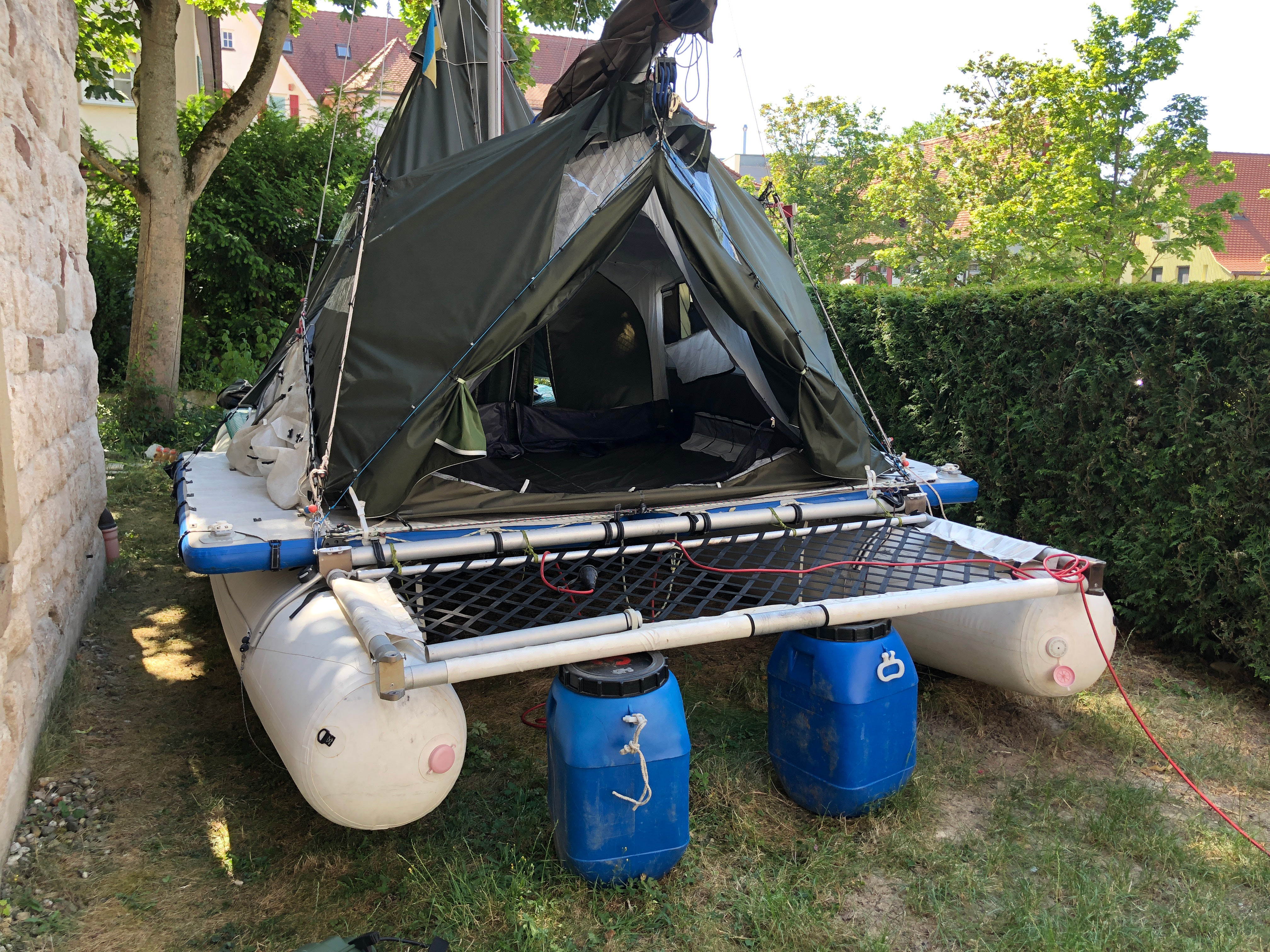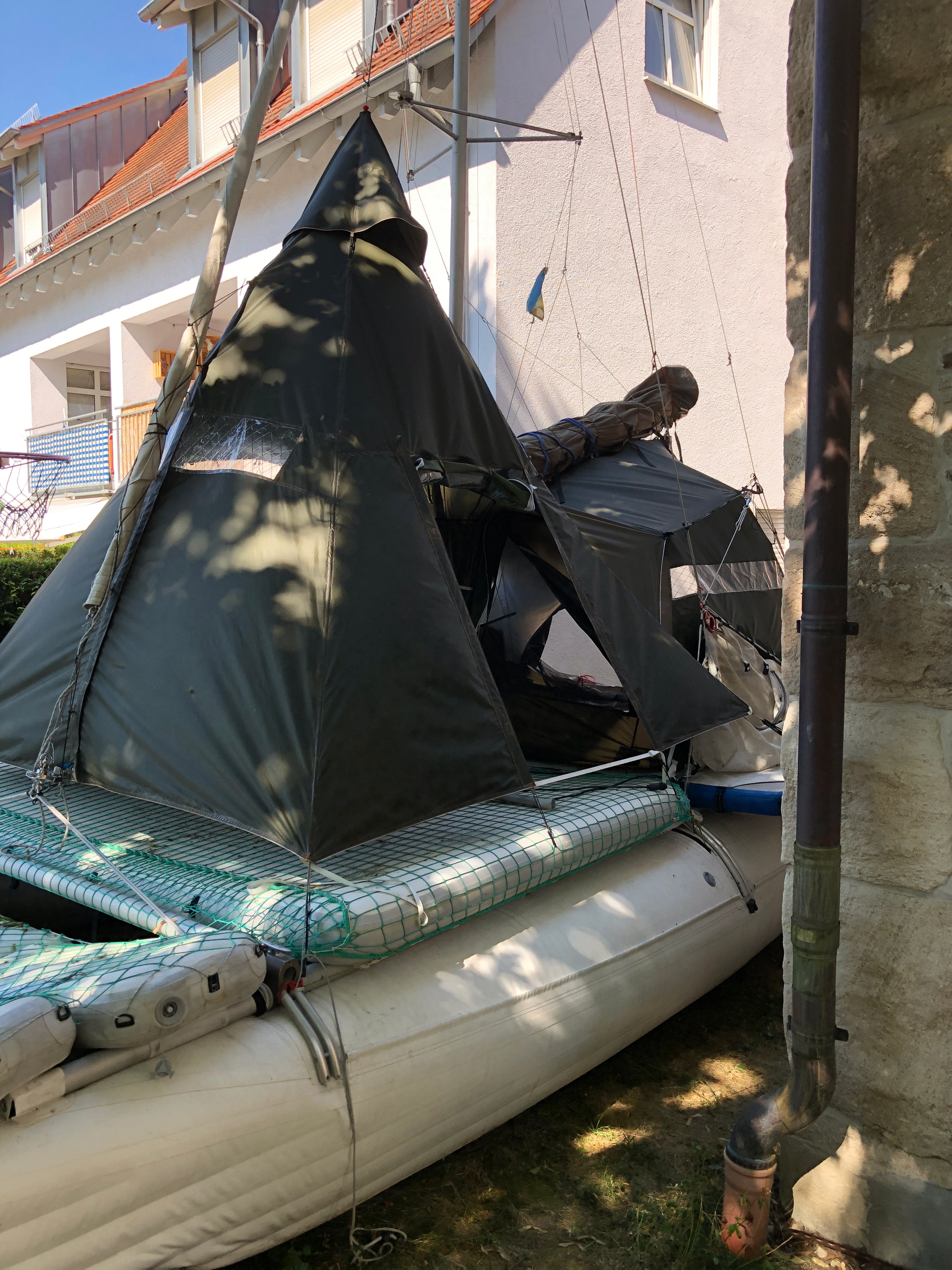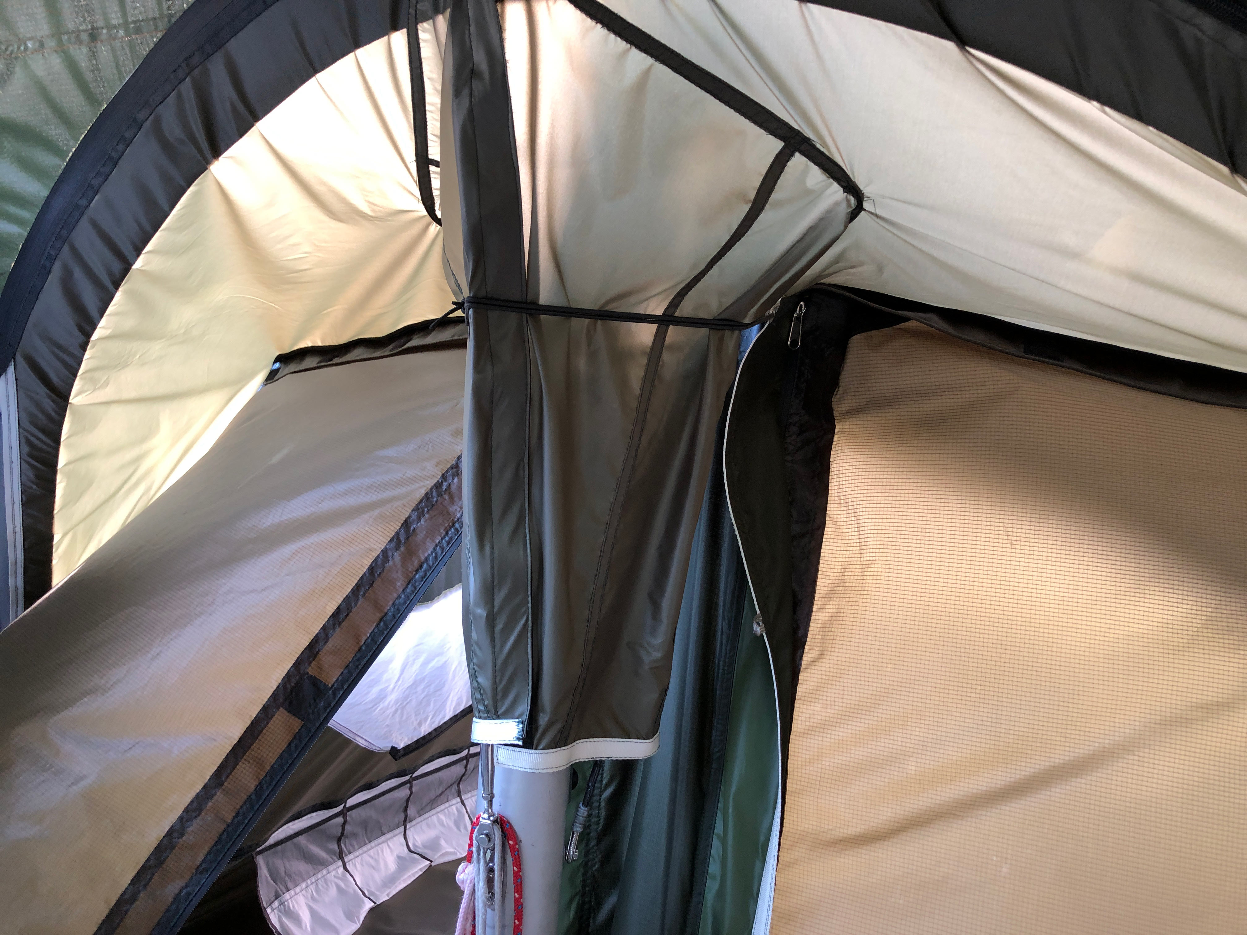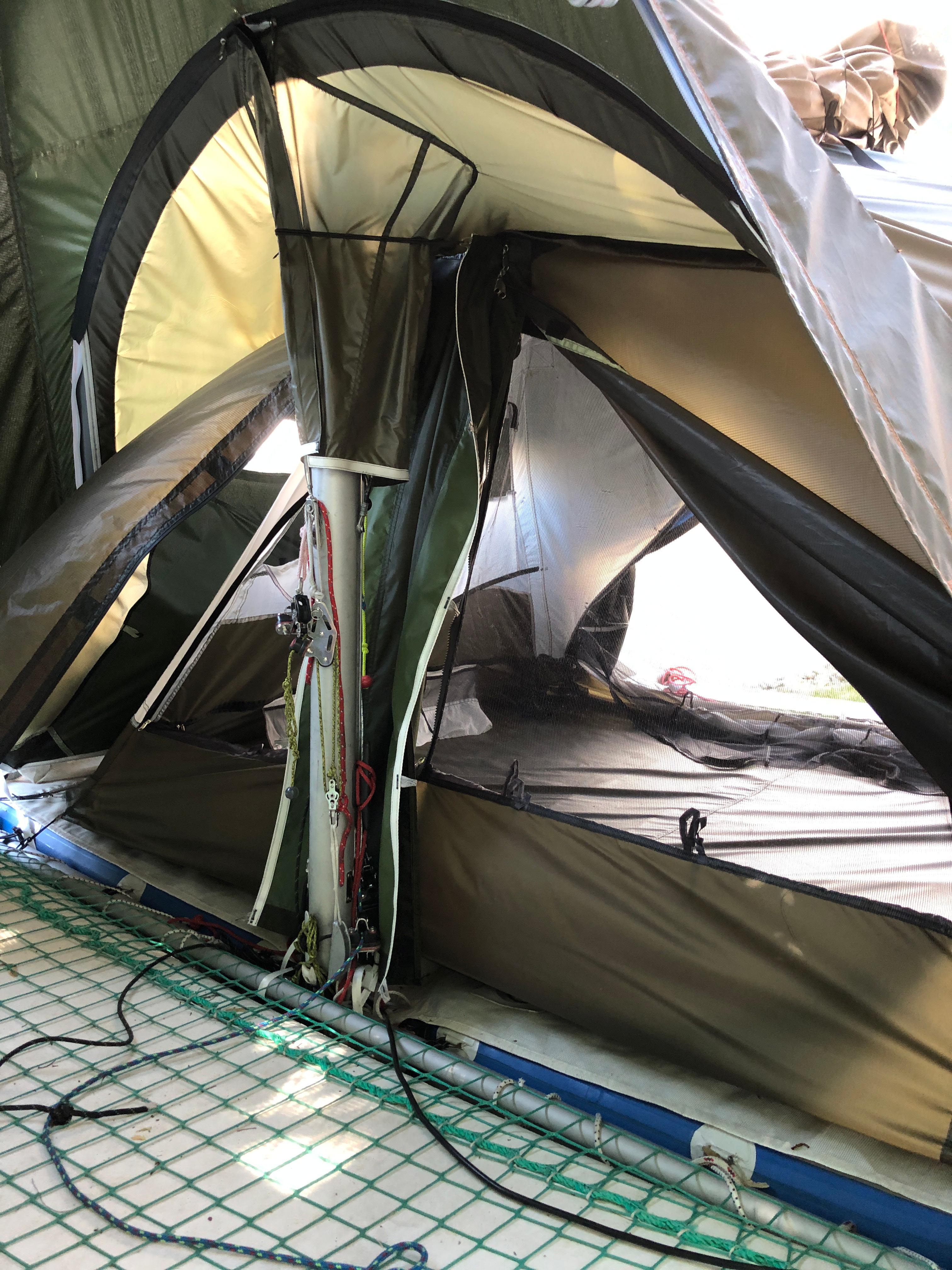 Спальная палатка расчитана на четверых. У каждого есть два кармана для личных вещей и крепление для бутылки с водой. Вход/выход из спальной палптки на корму и в кухонную палатку. Между палатками тамбуз защищающий от дождя. В внешней спальной палатке окна на три стороны. Во внутренней, напротив окон, вставки из черной противомоскитной сетки. Через эту сетку все видно, даже при низкой освещенности снаружи. Вставки могут прикрываться занавесками, это для того, чтобы при вклученном освещении в палатке снаружи не просматривалось. Ппротивомоскитные сетки на обоих выходах также могут закрываться полностью или частично непродуваемым слоем.