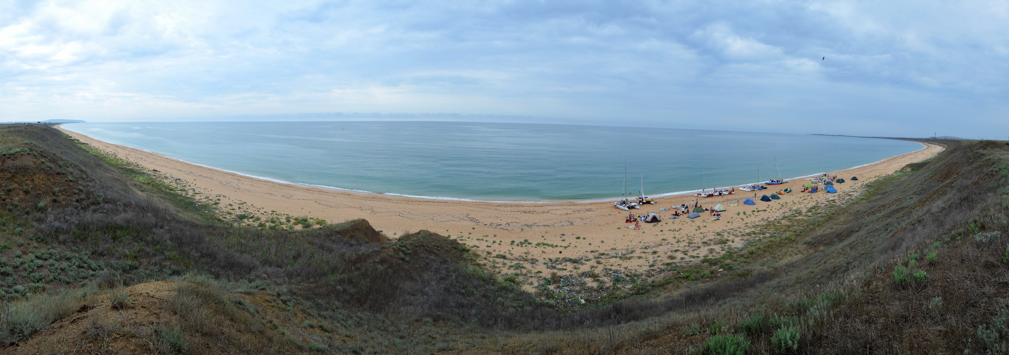 Черноморское побережье Керченского полуострова занято заповедниками, военными базами и полигонами, а отсутствие отдыхающих придаёт особый шарм этим местам. Испытываешь смешанные чувства, когда видишь брошенные поселения, военные базы и прочие сооружения неизвестного назначения. Мы не удержались и сделали короткую вылазку на берег, чтобы рассмотреть этот постапокалиптический пейзаж поближе. Когда снова вышли на воду ветер стал совсем слабый. Так, на последнем дыхании, и добрались до места стоянки. Задолго до подхода к берегу был слышен звук, сначала напомнивший звук проходящего товарного поезда, но после идентифицированный, как прибой. В этом месте дно глубокое и весь накат сразу обрушивается на берег. Хоть ветра почти не было, но морская зыбь образовала неслабый прибой, грозивший проблемами зазевавшимся экипажам. Когда вышли на берег, узнали про ещё один сюрприз. Читая дневник похода Мистраля и Ко вдоль морского побережья Украины, запомнился момент встречи путешественников с ядовитым пауком Каракуртом (Чёрная Вдова). Это произошло как раз в этих местах. Также, из других источников было известно, что эти пауки здесь есть и встреча с ними весьма вероятна. Но когда оказалось, что они совсем рядом, прямо на пляже и в буквальном смысле слова практически под каждым кустом – стало не по себе. Не в нашу пользу было и время – июнь – период повышенной активности этой живности. После заката пришёл туман, от которого всё стало мокрым, как от дождя. Возможно, этот фактор сдерживал активность пауков, поскольку они сидели под своими кустами и бегать, похоже, не собирались.