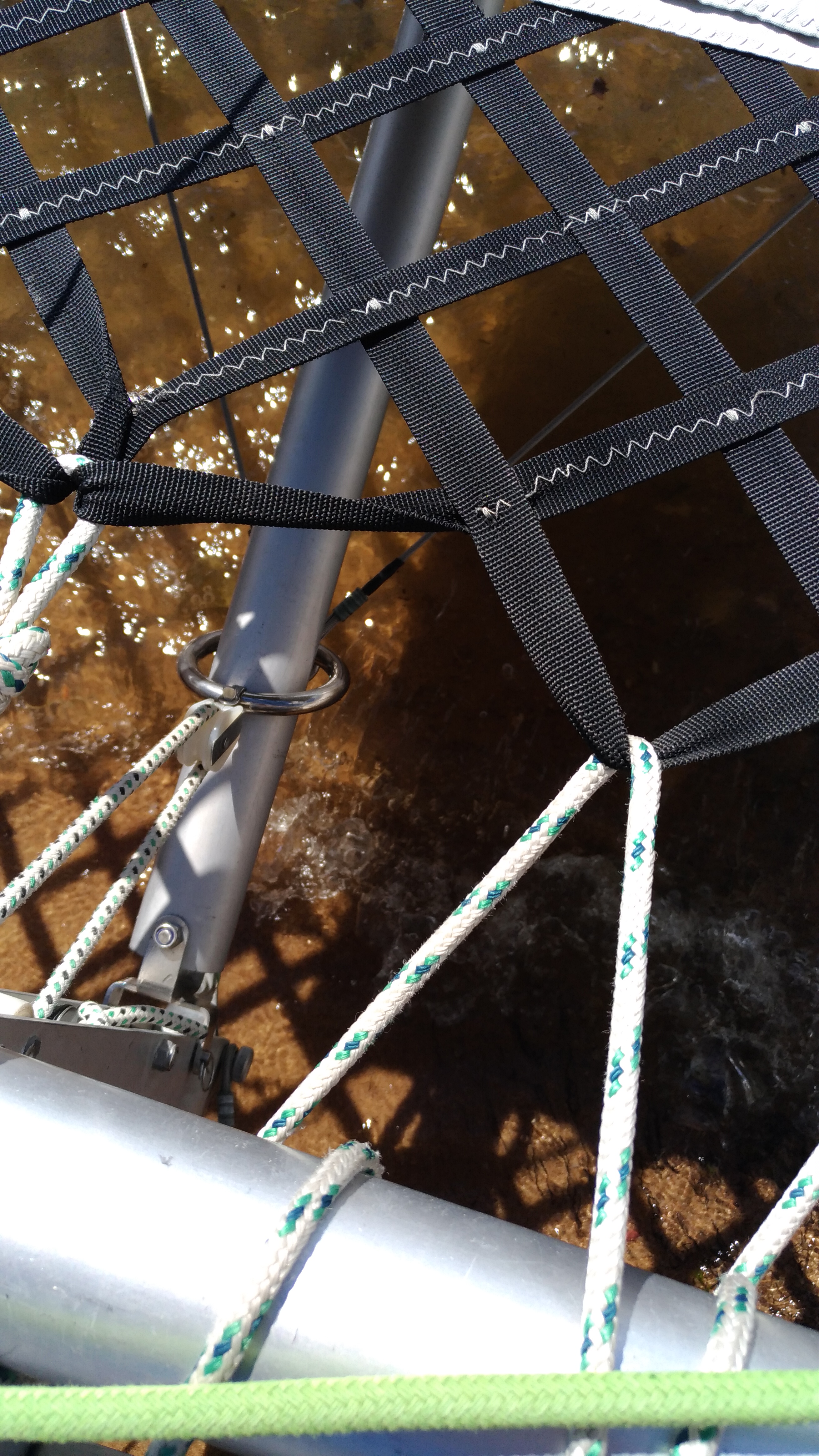 На доступных мне фотографиях и из инструкции веревочный талреп на бушприте не просматривается. Хотя на старом катамаране у меня он был, подтягивал бушприт вверх к кольцу соединения переднего шпрюйта и штага, и не давал бушприту упасть в отсутствие геннакера.