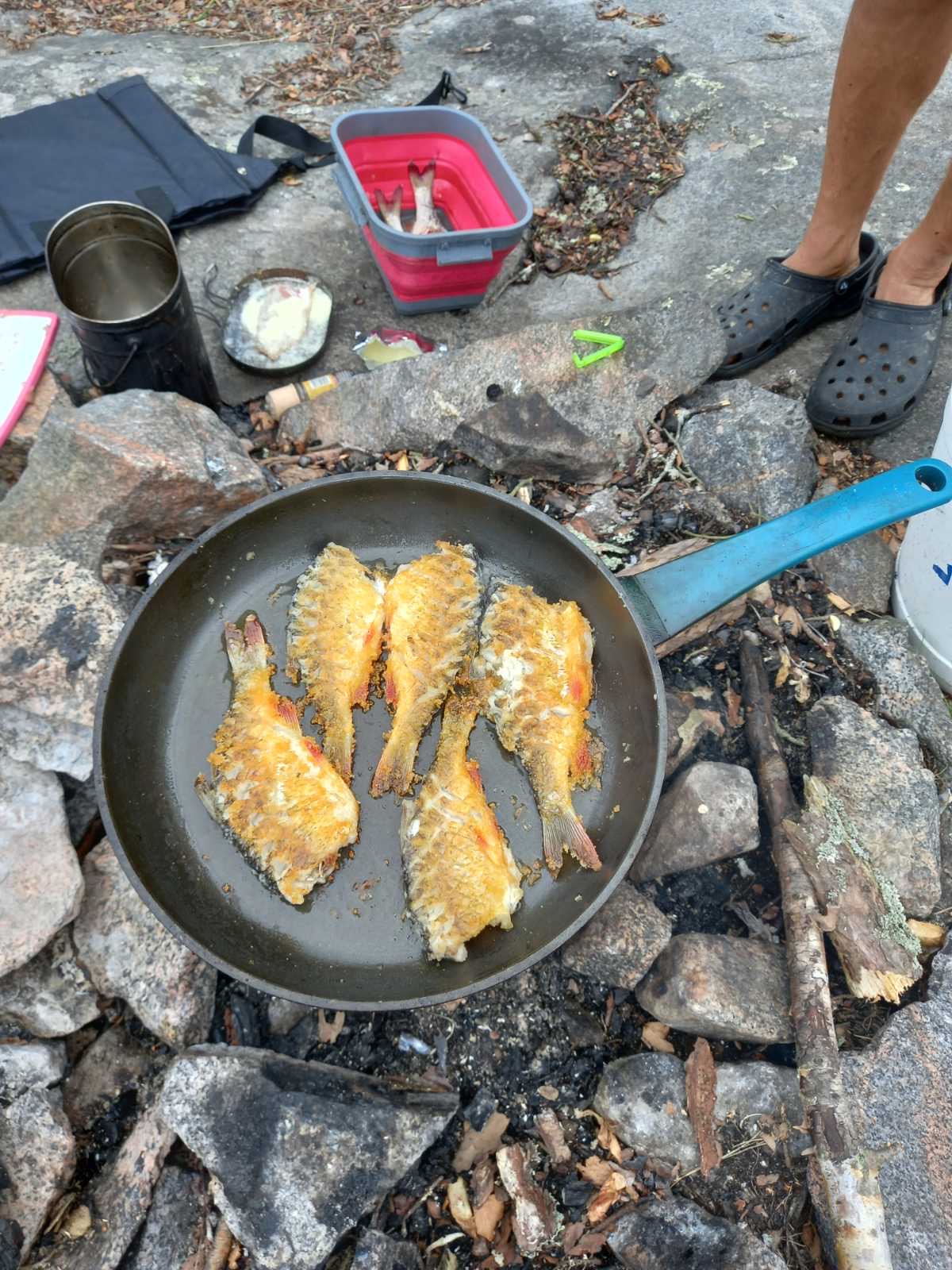 Оказалось, что спасает ловля на кузнечиков. Хорошо, что у детей товарища бы два сачка для ловли бабочек. Теперь каждый день с рыбой - плотва и жерех. Пяти кузнечиков хватает для обеспечения рыбой трёх человек на день.