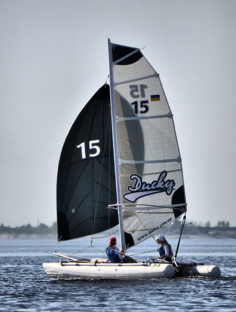 Gennaker is an asymmetric spinnaker for downwind running including beam reach. A catamaran with gennaker significantly increases the speed, and in a fresh wind it can reach the hydroplaning mode. Recommended for advanced users.