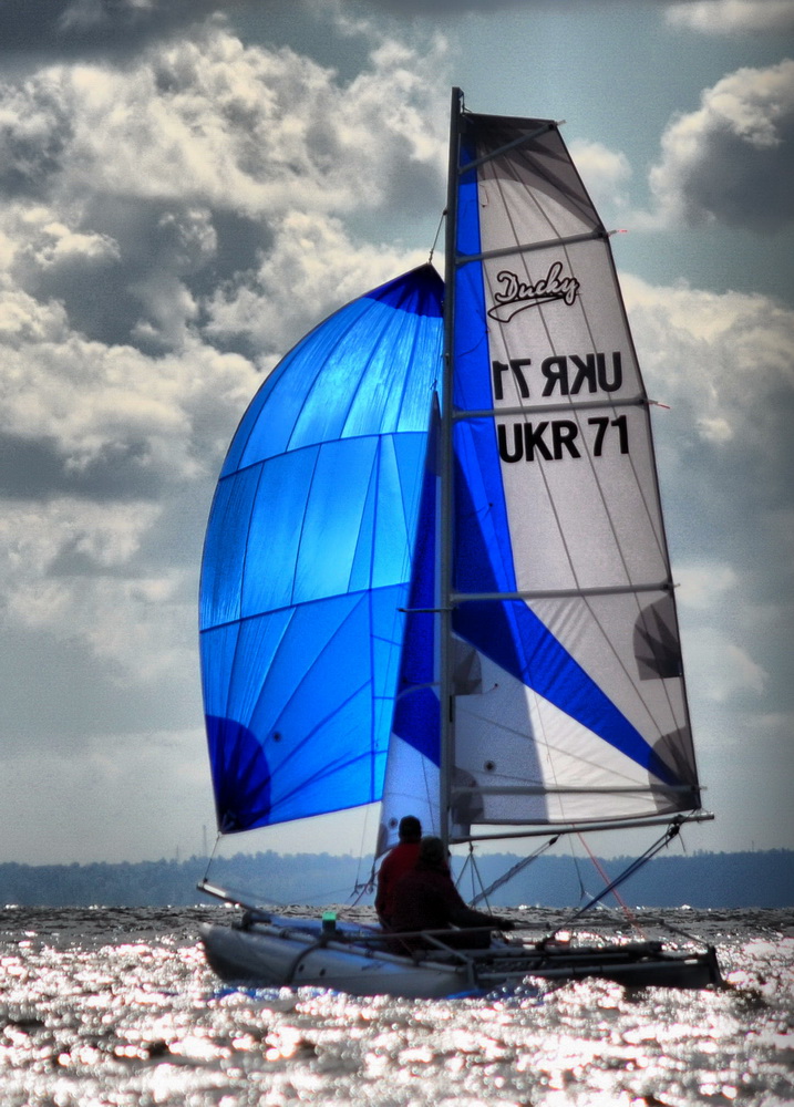 Gennaker is an asymmetric spinnaker for downwind running including beam reach. A catamaran with gennaker significantly increases the speed, and in a fresh wind it can reach the hydroplaning mode. Recommended for advanced users.