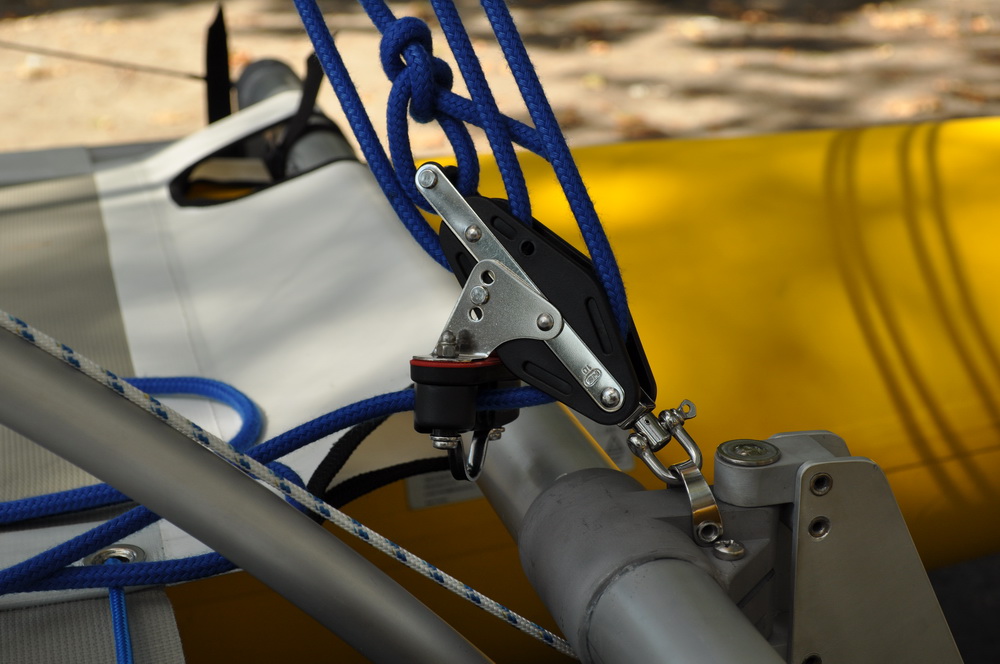 3. Верхний блок гика-шкота, при помощи шнура крепится за винт на конце уишбона. Нижний блок со стопором крепится к скобе на рулевом узле или уздечкой из шнура, привязанного за кормовые шпангоуты, если у вас белее ранняя модель Даки15.