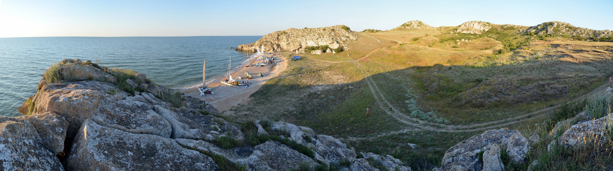 27 июня 2013г. В этот день, в планах была стоянка на генеральских пляжах, в одной из бухт, не доходя до мыса Чаганы. На всякий случай запланировали промежуточный финиш в Курортном. До первого мыса флот шёл в лавировку, но после огибания мыса получилось нести геннакер, что существенно ускорило продвижение. Основная часть флота быстро добралась до Курортного, гдебыло принято решение идти дальше. После дозаправки пивом и мороженым регата двинулась вперёд. Крутой бакштаг под геннакером в свежий ветер - идеальная комбинация. До назначенной бухты добрались очень быстро. Хоть максимальная скорость в этом переходе не блистала и была немногим больше20 км/ч, зато средняя вышла около 15 км/ч, что само по себе неплохо. В запланированной бухте, всё же остановится не получилось, так как её оккупировали нудисты. Решили остановиться в соседней, никем не занятой бухте. Оставшееся время гуляли по окресностям и отдыхали. Когда солнце спряталось за горизонтом, проявилось удивительной красоты звёздное небо. День удался!