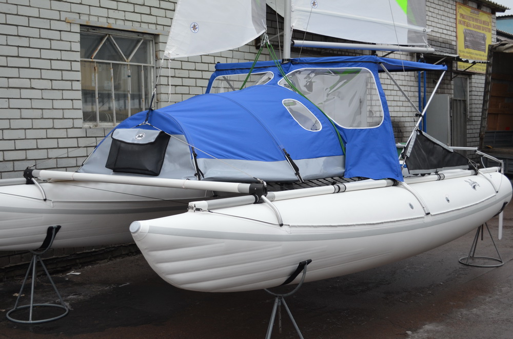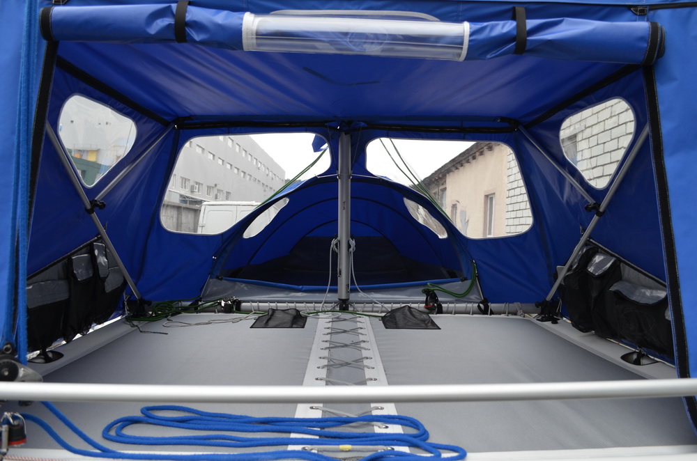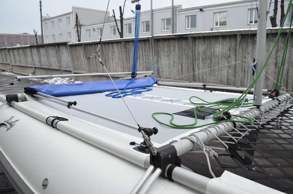 4. Стенки тента кокпита. Предназначены для защиты от ветра и осадков. Могут быть установлены на ходу. При этом остаётся возможность выхода в носовую и кормовую части катамарана.