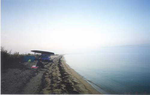 с 14.00 до 16.00. идем вдоль обрывистого берега. Слышен шум моторов и ритмичные хлопки. Это моторки-плоскодонки местных любителей рыбы прыгают по волнам. 17.00. Прошли лечебницы, пансионаты, дома. При подходе к косе Федотова за Степком в прибое ломаем перо руля. Абзац. Великий и могучий язык дает вволю выразиться чувствам .... Нашли обломок доски или весла, "адаптировали", установили. 20.00. Ужин. Поход к рыбацкому прицепчику. Обмен впечатлениями и новостями. Отбой в палатке на пляже. Сон... 24.00. Ближе к полуночи начинается оживленное движение транспорта: грузовики, небольшие фуры, джипы и джипчики. Все несутся по пляжу, ближе к кромке прибоя, по уплотненному песку. Шо автобан.