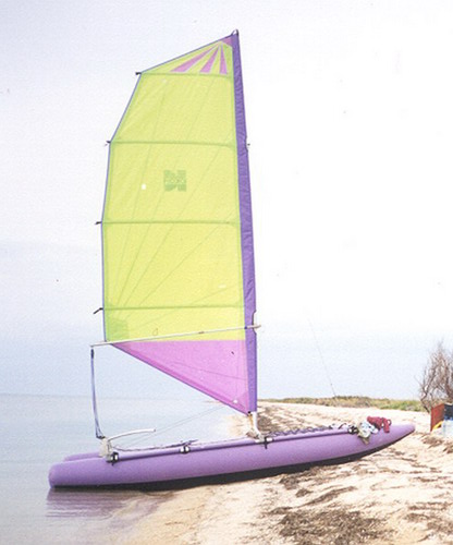 Катамаран Ducky15, сиреневый. Капитан ( в красном непромоканце) и матрос ( в желтом ), два рюкзака с походным снаряжением ( палатка, запасная сухая одежда, еда, вода, карта и компас ), два дюралевых весла, хорошая погода.