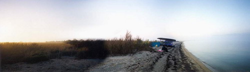 9.00. Волнение и свежий ветер. Поблагадарили за приют и уют. Отчалили... 12.00. Обошли Бердянскую косу... ( пансионатов на ней натыкали...) около 16.30. Штормит и сильно дует, причаливаем на Обиточной косе ( чуть дальше ее середины ), перетаскиваем катамаран ( похоже что были столбы с проводами, не помню...), и ставим на тихую воду. Ветер, перелетая гребень косы, не рябит воду и толкает парус. Тихо и ровно двигаемся в тросниково-камышевых заводях. Птиц разных - не меряно! Всякие водоплавающие, от уток и журавлей до черных и белых лебедей. Красота .. Тихо. Показывается солнышко, теплеет. до 18.00. успеваем осмотреть руины кораблей, перебраться на внешний край косы, разбить лагерь, окунуться в прохладной воде моря, приготовить ужин и лечь спать....