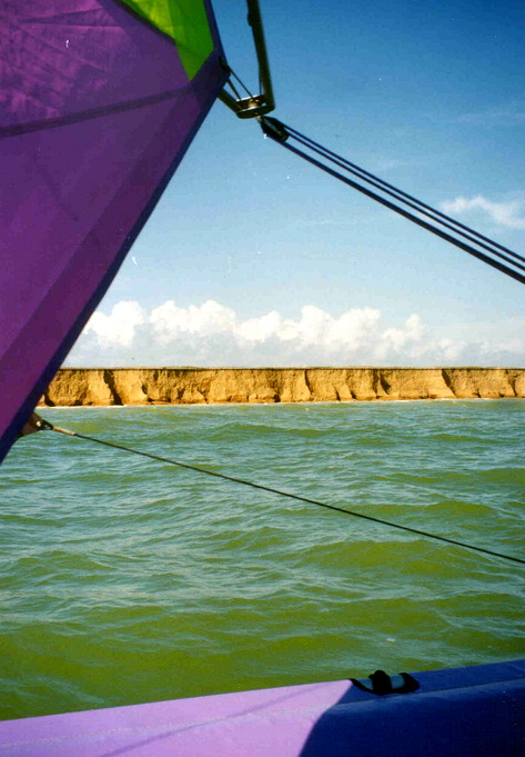 9.00. Прошли вчерашнее "черное место", напротив входа в грузовую гавань "Главного" порта". 10.00. Хорошо идем, пригруженны и уверенны, догоняем и обгоняем попутные волны. Берег еле виден. Прошли "Белосарайку" ( наверное ) 11.00. Ветер крепчает...