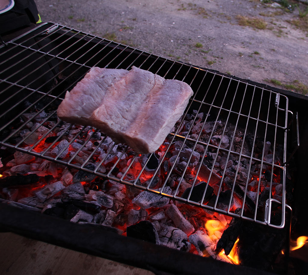 Несколько фоток с барбекю. Замариновал мясо как на шашлыки. Но поскольку шампуров не было, то на куски не резал, а распластовал биточную спину по спирали толщиной около четырёх сантиметров.