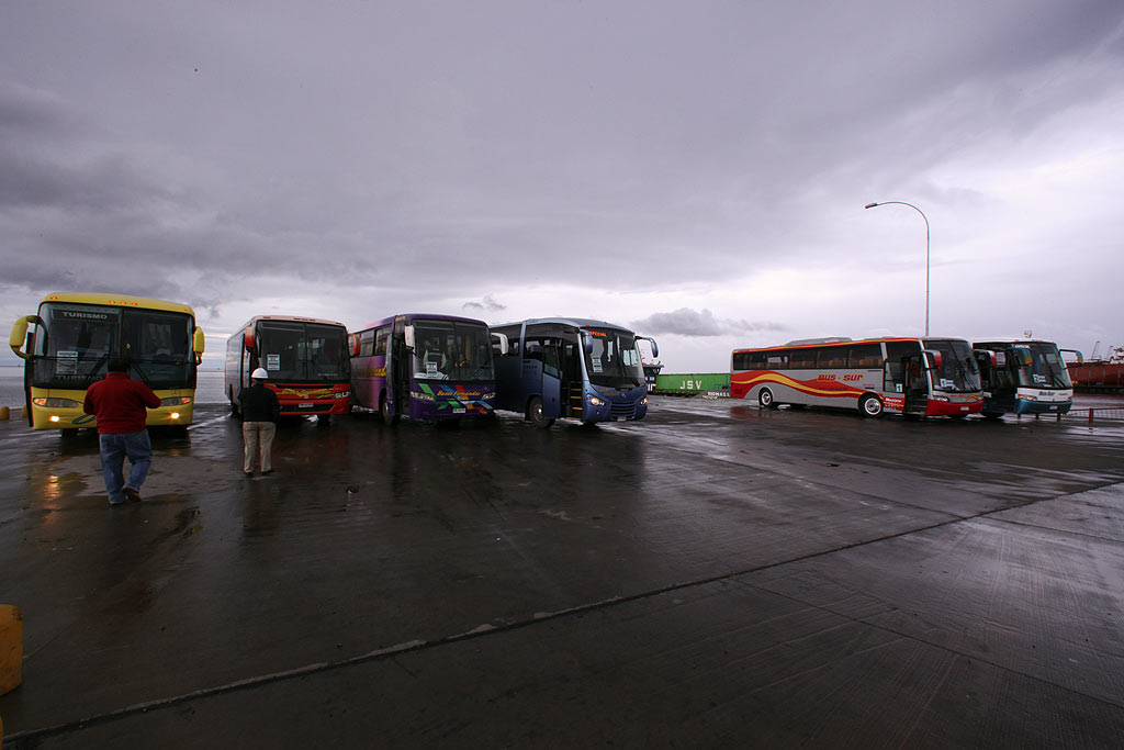 Приехали на пирс, парома ещё нет, катает туристов. Весь пирс забит автобусами и машинами ожидающими паром. Становимся в очередь.