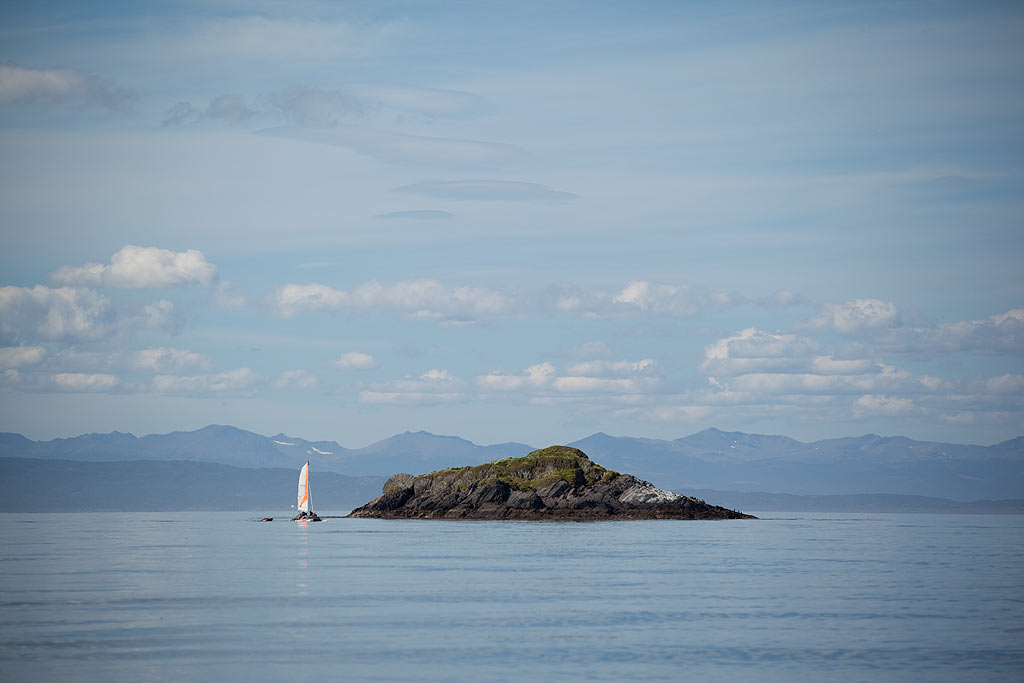 Мимо нас вдалеке на фоне гор прошел Олесин катамаран. Он шел по одним стакселем. Медленно и красиво. Нам оставалась только глядеть ему вослед.