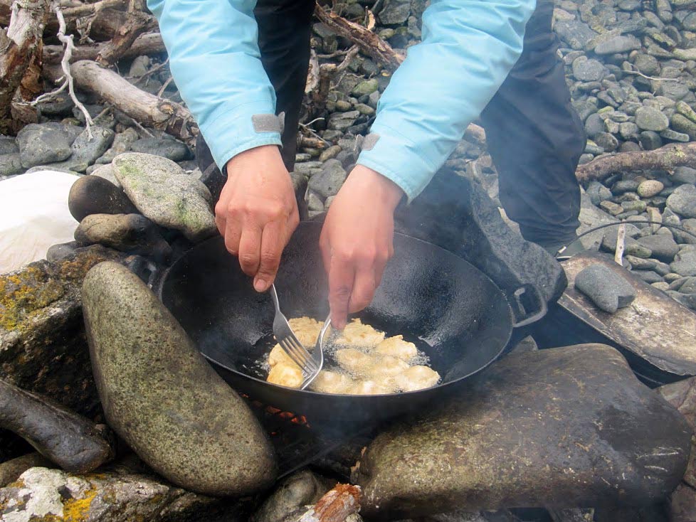 Буканов писал(а):6й день. В этот день погода была не очень. Дул сильный западный ветер, временами моросил дождь. На этот и следующий день у нас был прогноз погоды. Мы знали, что будет сильный ветер, так что стоять нам придётся скорее всего и следующий день. Мы не спеша делали завтрак, начали печь лепёшки вместо хлеба. Это просто мука, соль и вода. Эдик занимался ремонтом катамарана. Мимо нас проплывал тюлень, он высовывал голову из воды, смотрел на нас, казалось, мы заняли его место. Несколько раз проплывали дельфины. От бухты вверх уходила гора, заросшая кустарником, среди которых мы собирали дрова. Возле берега с обеих сторон были скалы, но по ним во время отлива можно было пробраться в соседнюю бухту. Но в этот день дул такой сильный ветер, что, высунувшись из-за скалы, тебя практически сдувало с ног. Поэтому мы целый день просидели в бухте. Наша палатка стояла недалеко от воды и, посмотрев карту приливов и отливов, мы поняли, что есть опасность, что ночью во время прилива нашу палатку может залить, так как приливы в это время с каждым днём увеличиваются. Убрать палатку выше невозможно, и если немного начнётся волна, нас точно зальёт. Перед тем, как лечь спать, мы все вещи привязали подальше от воды, поставили будильник на 3.30, а самый высокий прилив должен быть в 4 часа, и легли спать. Ночью прозвенел будильник, Эдик выглянул из палатки и сказал, что спим дальше. Было слышно, как вода хлюпает совсем рядом. Минут через 20 Костя встал, открыл тамбур и выскочил босиком прямо в воду. За ним вышел я. Вода стояла в тамбуре палатки, но до самой палатки не доходила. Волны не было, уже начинался отлив. Мы решили, что опасность нам не угрожает, и легли спать.