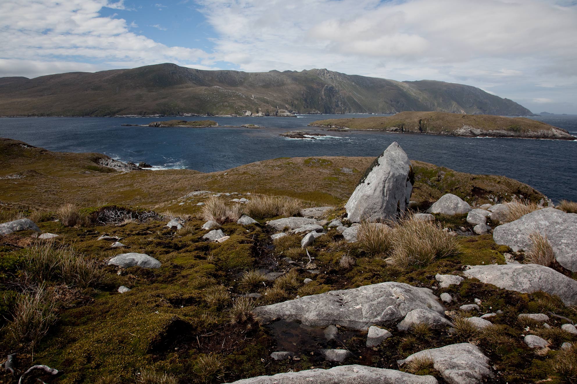 Пока я возился с тестом на токсины, немного распогодилось. Появилось солнце. Костя на мысу ловил рыбу, Марина бродилагде-то в "пампасах" с камерой. Я предложил Жене пробежаться за мыс вдоль берега. Подняться там повыше на склон и посмотреть оттуда на остров Горн. Сказано - сделано. Женя берёт штатив, а я опять вешаю на шею ремни от камер. И мы отправляемся в путь.