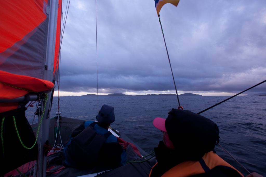 Собираем и пакуем снаряжение, пъём кофе. Ну вот уже посветлело. Я бросаю взгляд на море и вижу Олесин катамаран проходящий мимо. Наверное тоже встали затемно, и тут же снялись. Сказывается одно из преимуществ палатки на катамаране - сокращение времени готовности на выход. Нам ещё пол часа где-то возиться. Олесин катамаран огибает наш остров справа. Похоже они хотят выйти повыше на ветер прежде чем повернуть на Мыс Горн. Мы вчера отказались от этого варианта. Меня пугают предупреждения о сулоях и обрушивающихся волнах в проливе между островами. Мы пойдём другим путём. Хотя может они просто обходят наш остров с этой стороны, а обойдя повернут на юг вместо на запад. Ну да ладно, это их дела. Мы допаковываемся и выходим. Ветер слабый встречный. Времени лавироваться нет, идём под мотором.