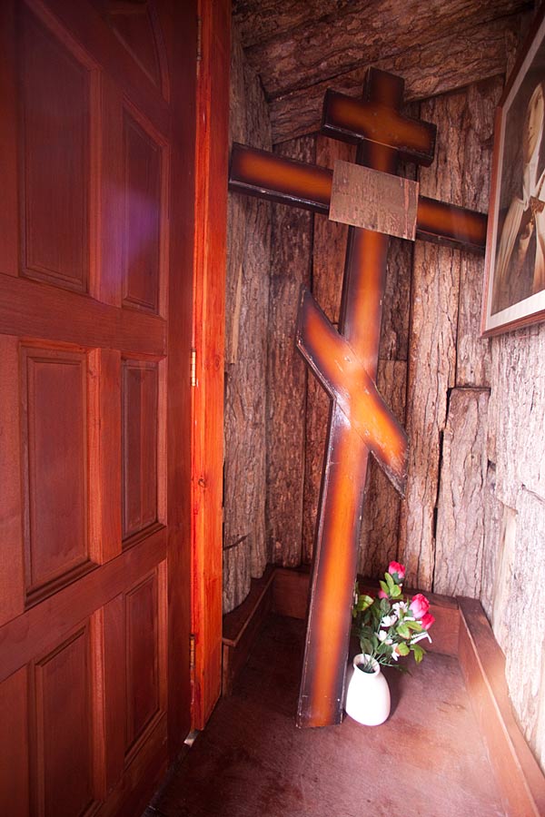 Перед маяком небольшая деревянная часовенка. Заглядываем во внутрь. Очень чисто, аскетичная обстановка, ничего лишнего. Из необычного - портреты Пап и какой-то женщины, а рядом под стеклом, на стене, китель. К сожалению из надписи по испански я не понял кто эта женщина на портрете. В Интернете седений найти мне не удалось. Так же, как и истории постройки этой часовенки.