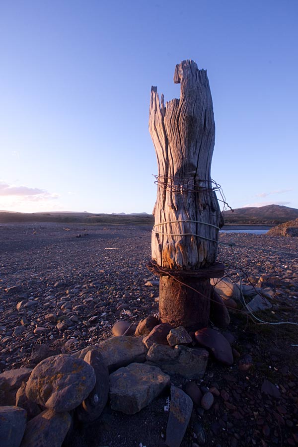 И мы пошли бродить по округе. Крученые стволы деревьев однозначно указывают на преобладающее направление ветров. На открытых местах деревья имеют вид кустарников, и только в прикрытых от ветра понижениях они вырастают во всю силу, имеют крепкие толстые стволы. К великой радости вечных грызунов, которых здесь водится великое множество. Это я о бобрах. В этой местности у них нет никаких врагов и они властвуют безоглядно. Даже на высоких местах попадаются почиканные стволы, как заточенные топором колья. А маленький ручеек превращен ими в каскад прудов. Высота плотин доходит до полутора метров. Плотины уже старые, поросшие травой. По ним можно ходить. Эдуард рыбачил с такой.