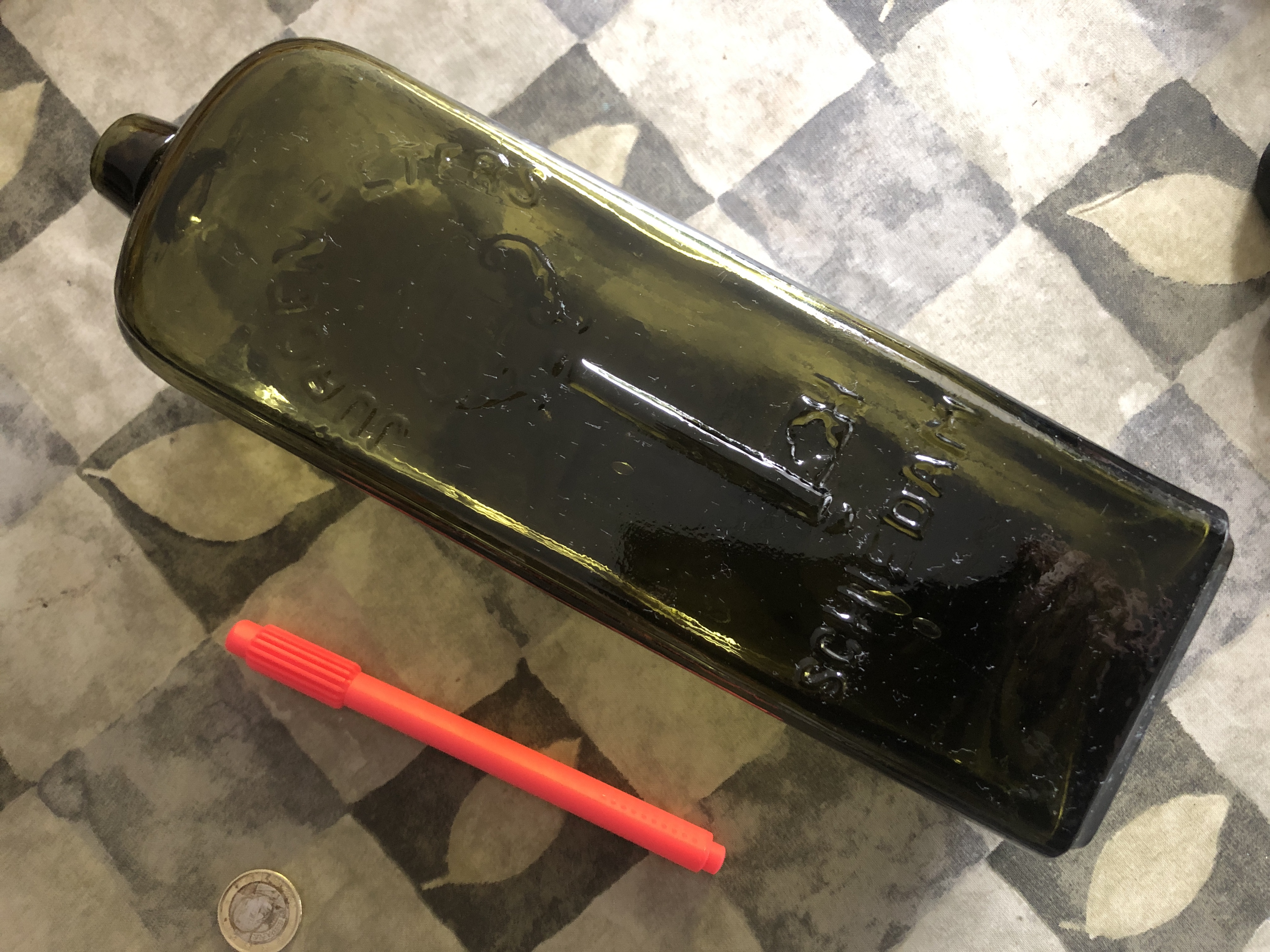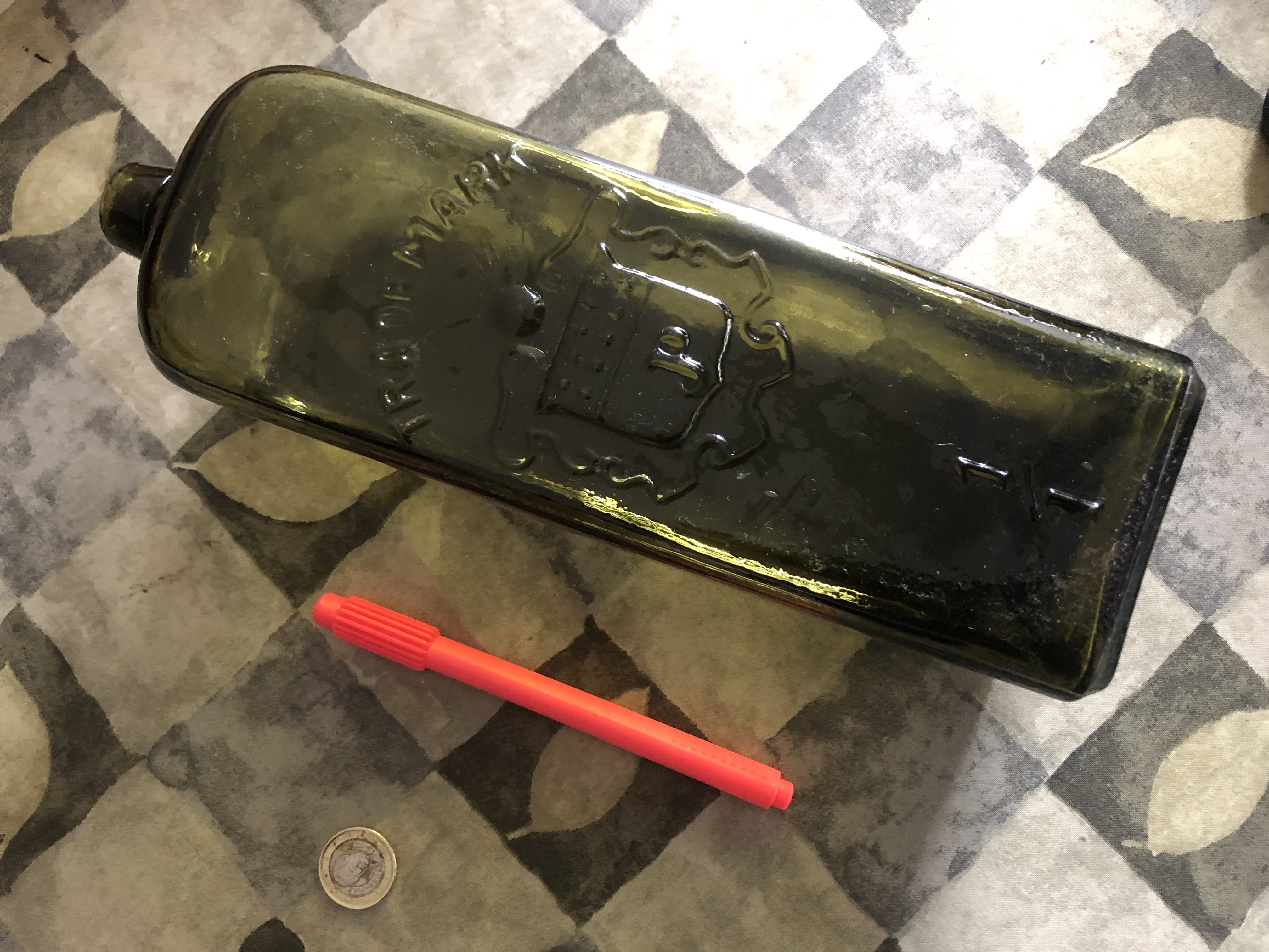 На берегу делать нечего из за ветра, пошел исследовать внутрянку. какие-то старые заболоченые гати. Расплывшиеся валы, погрызенные бобрами деревья. Бобровые хатки и плотины. Вдруг в траве что-то блеснуло, подошел, оказалось квадратное донышко зеленой бутылки. Раскопал какой-то палкой и вытащил. Смутило очень тонкое горлышко, такое раньше ипользовали для закупорки сургучем, на стенке непонятное тиснение, интересно. Забрал с собой в лагерь. У же по приезду, когда очистил и провел поиск в интернете, обнаружилось, что это бутылка в районе 1880-1890 годов от шнапса(джина,). Марина нашла вторую такую же, но та была треснутая и раскололась при выкапывании. Решил порыться еще в интернете и нашел, что место нашего пребывания было связанно с золотой лихорадкой.
