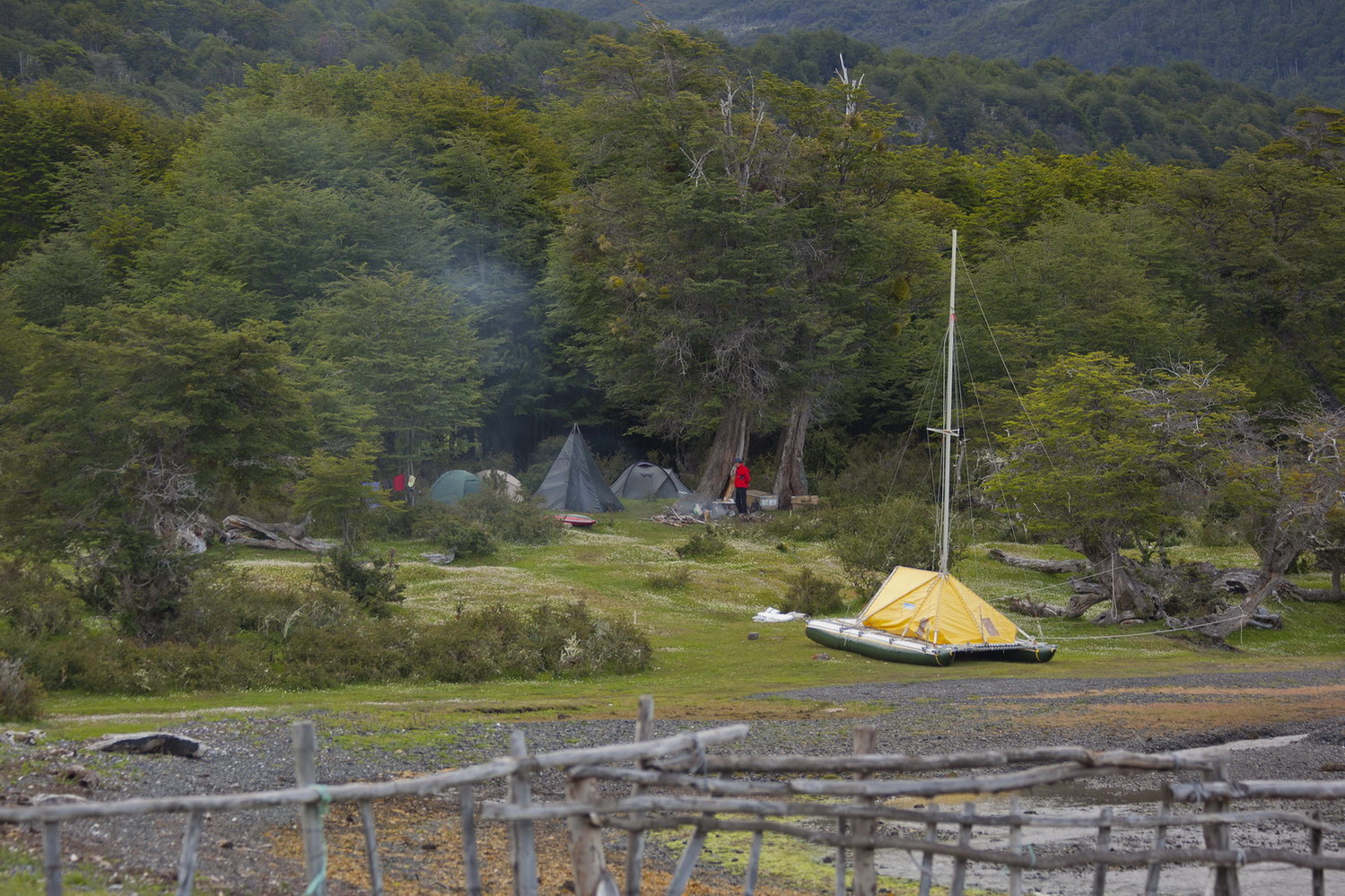 Так день проходил за днем. Мы основательно обжили лагерь и освоили территорию. Местные тоже к нам попривыкли. Как-то, когда катамаран уже собрали, приехали пограничники, проверили документы. Оказывается, они решили, что мы нелегально переплыли с Аргентины. Сфотографировали катамаран и вполне дружелюбно расстались. Вот наш лагерь издали: