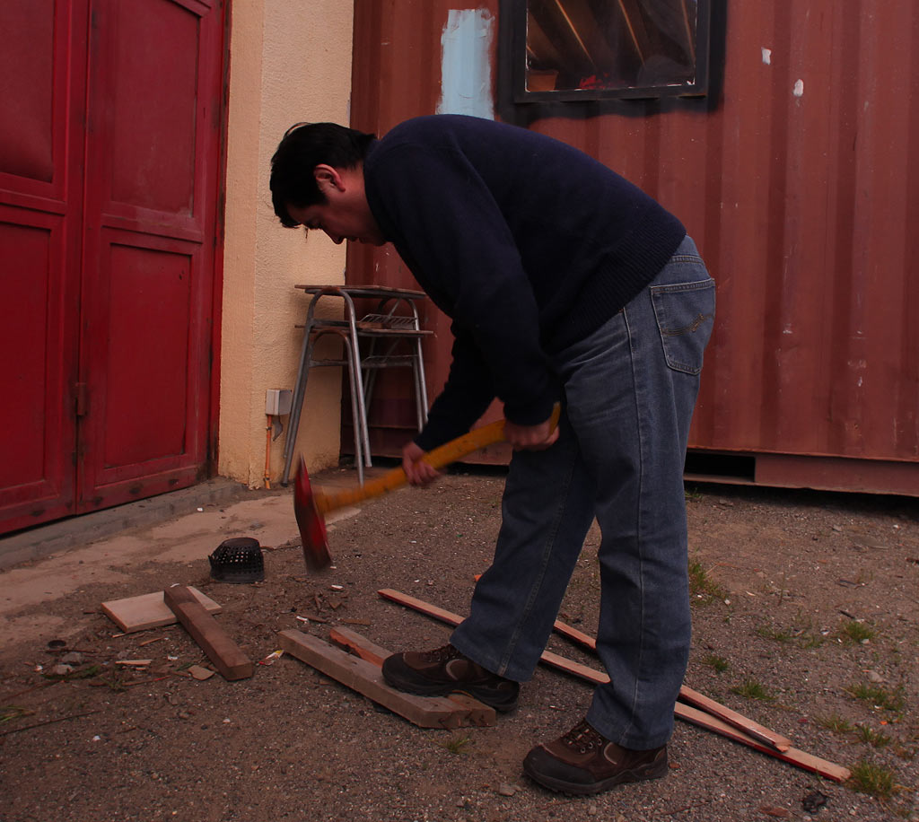 Погрузчиком его достают и вывозят во двор на открытое место.