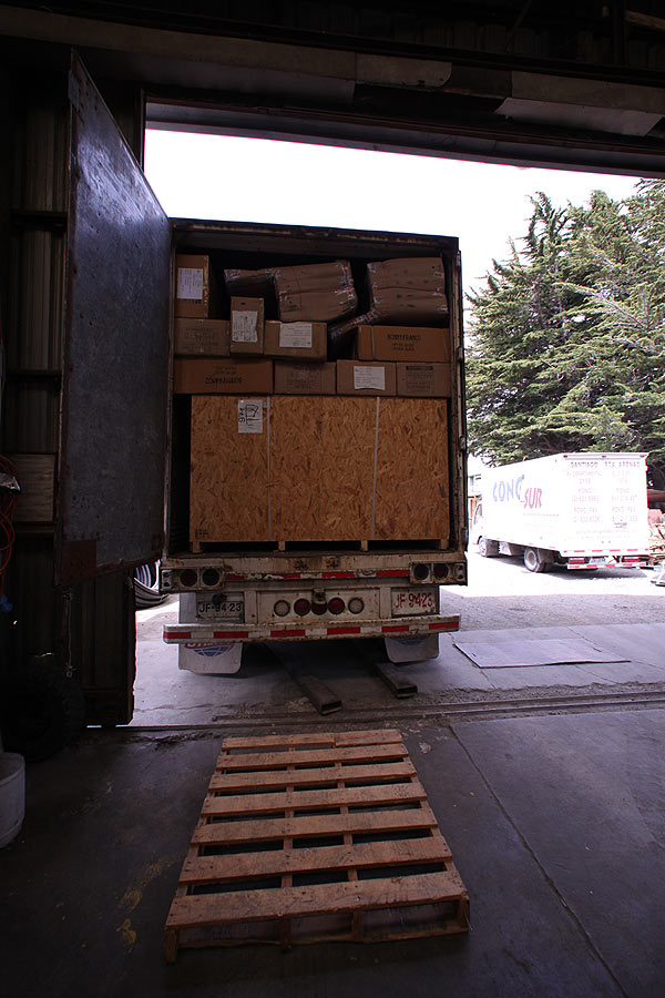 слегка приподнимают краном, грузовик отъезжает, и мой ящик плавно опускается на пару поддонов, открывающейся стороной к стенке, так, на всякий случай.