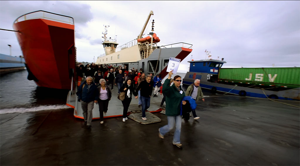 Вот он уже опустил аппарель, а там туристов как... как пингвинов