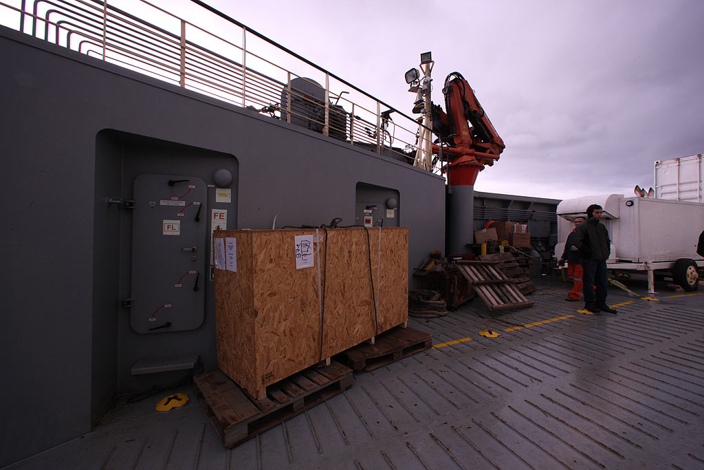 Прихожу в транспортную фирму. Там уже подготовили ящик для разгрузки. Дело в том, что на пароме нет погрузчика, только кран. А грузовичок имеет несъёмные дуги. Поэтому ящик сместили максимально к заднему борту, чтобы можно было краном вытянуть.