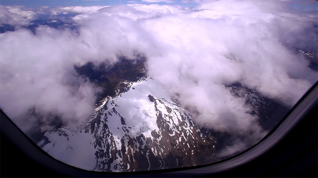Земля закрыта облаками, но иногда встречаются просветы, и через них видны заснеженные вершины Патагонии.